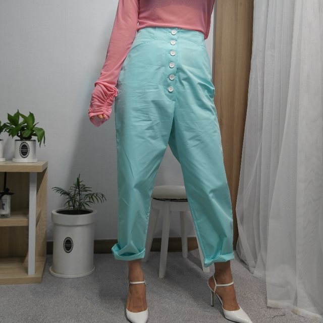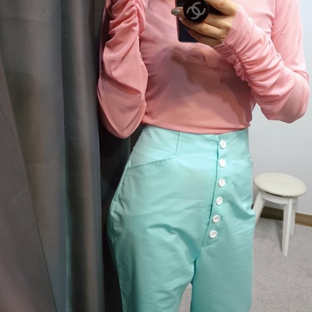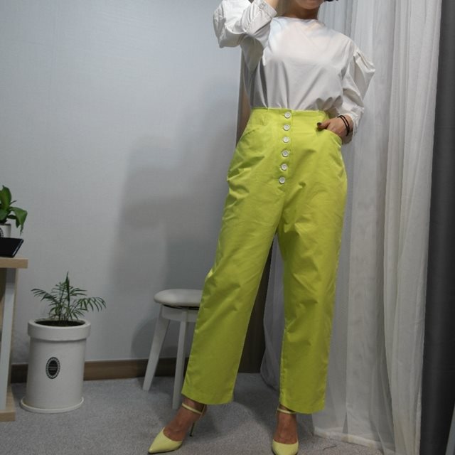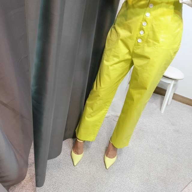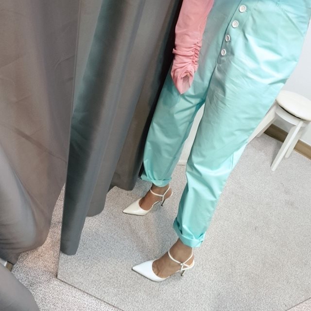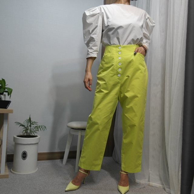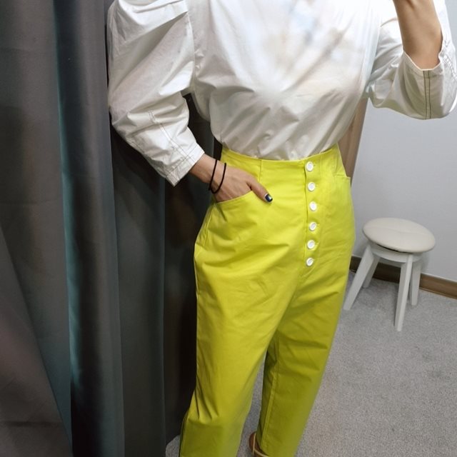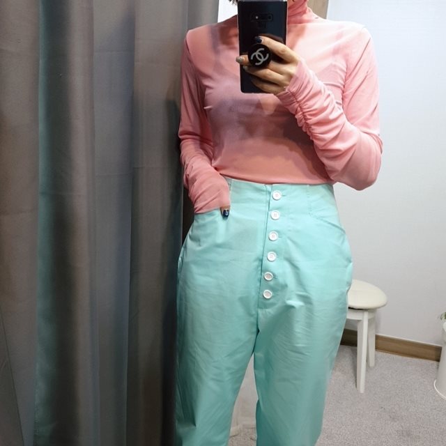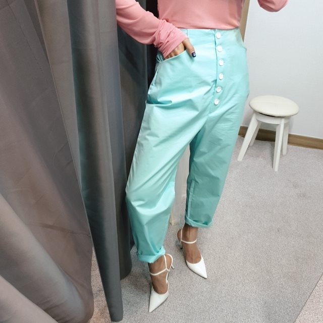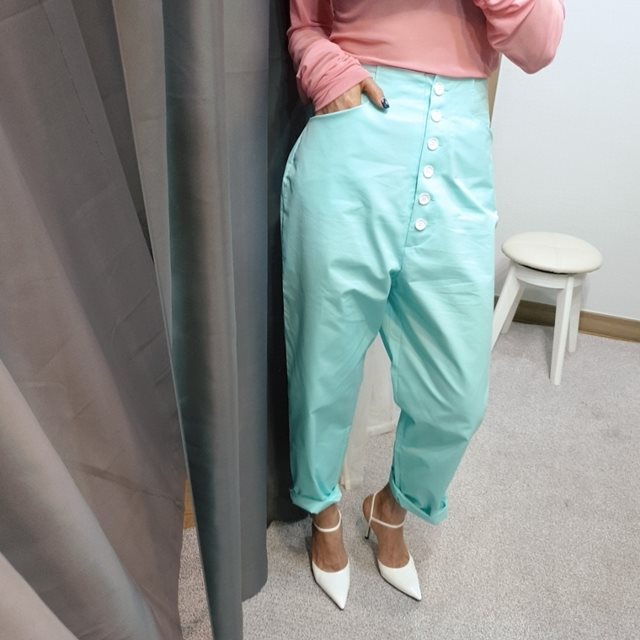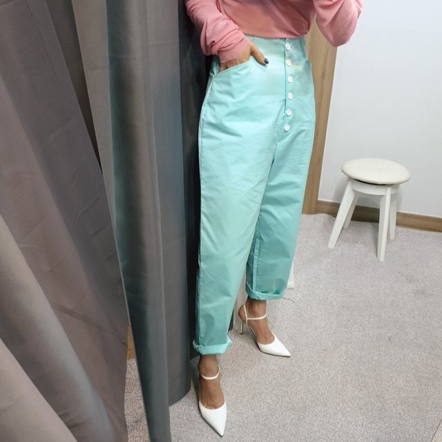 발목은 상대적으로 얇아 보이게 해주며 흔하지 않은 컬러감으로 포인트룩으로 좋은 슬랙스 바지에요