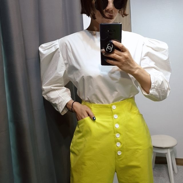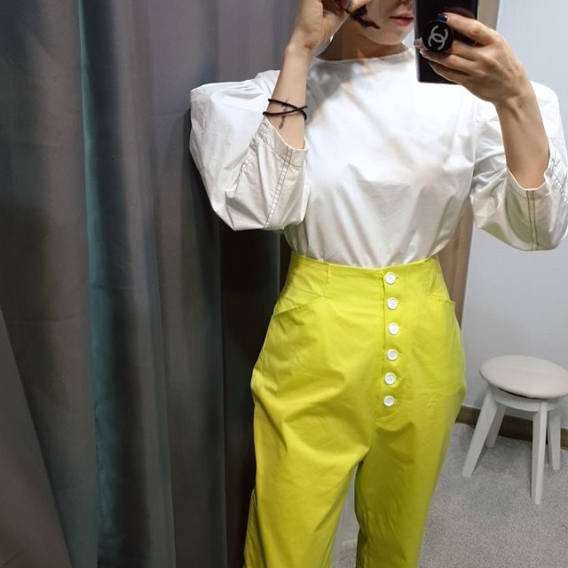 하이웨스트라 허리라인을 예쁘게 잡아주며 앞쪽 단추가 포인트가 되어주고 하체 커버에도 최고에요