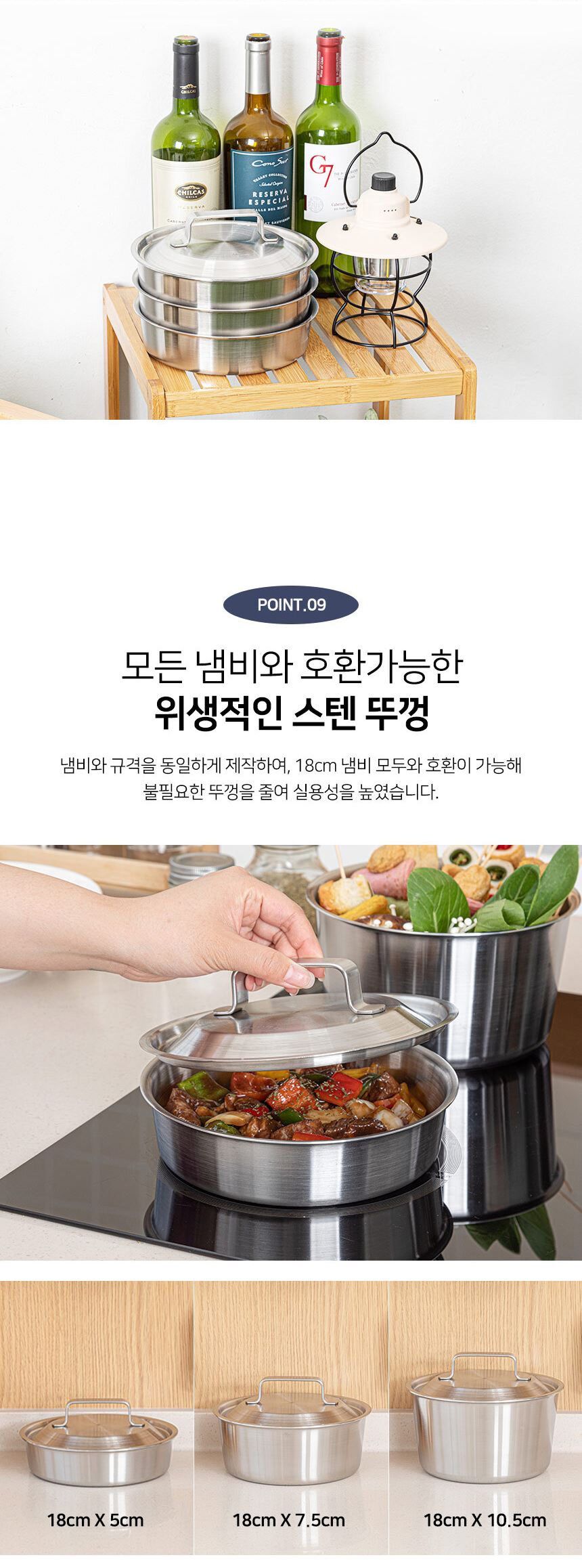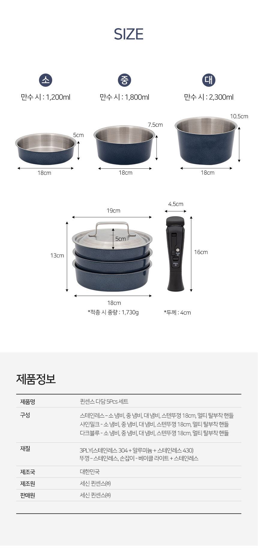 크기(m, cm, mm) 냄비 소-18cmX5cm용량-1200ml/중-18cmX7,5cm용량-1800ml/대-18cmX10,5cm용량-2,300ml/핸들-16cmX4,5cm