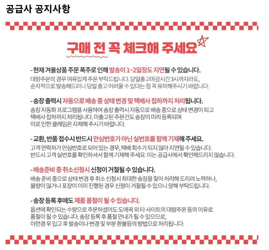 ㆍ 상품의 재고상황이나 배송 상황, 지역에 따라 배송 지연될 수 있으며 이 경우 기입된 정보로 연락을 드립니다.