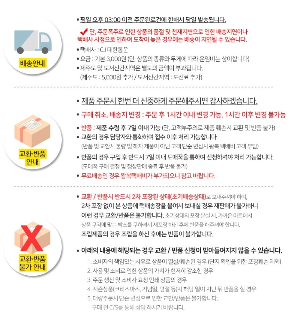 ㆍ 반품/교환 시 고객님 귀책사유로 인해 수거가 지연될 경우에는 반품이 제한될 수 있습니다.
