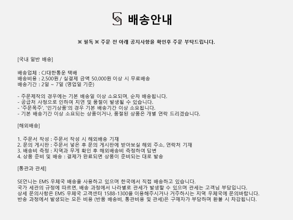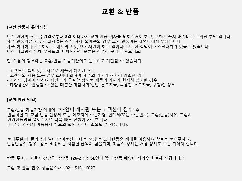ㆍ 상품 수령일로부터 7일 이내 반품, 교환 가능합니다. ㆍ 단순변심 및 고객님의 사정으로 반품, 교환 하실 경우, 반송비(교환의 경우 왕복배송비)는 고객님 부담입니다. ㆍ 상품의 내용이 표시·광고의 내용과 다른 경우에는 상품을 수령한 날부터 3개월 이내, 그 사실을 안 날 또는 알 수 있었던 날부터 30일 이내에 청약철회 가능합니다. ㆍ 디지털 상품의 경우 상품의 속성에 따라 교환 및 반품의 기준이 다를 수 있습니다.