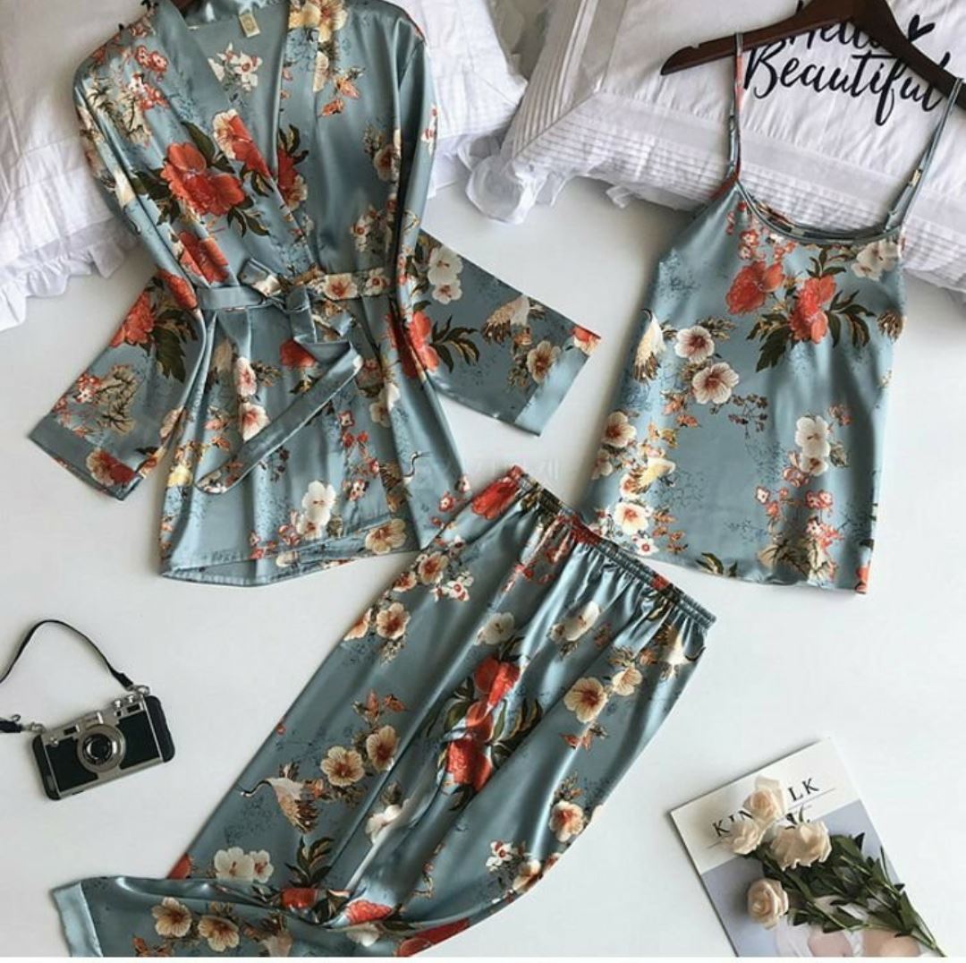 로브가운 , 나시 , 긴바지 3종 구성의 실크잠옷세트 에요