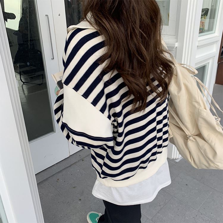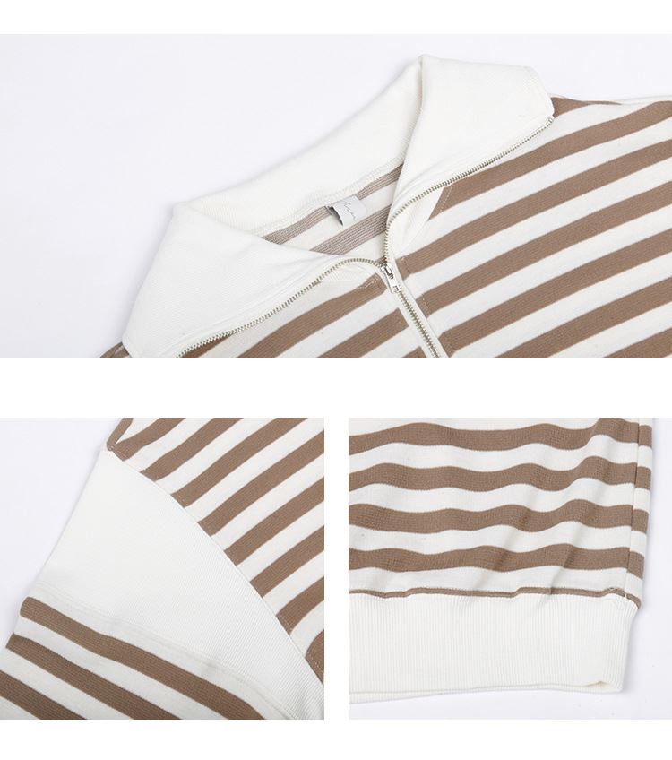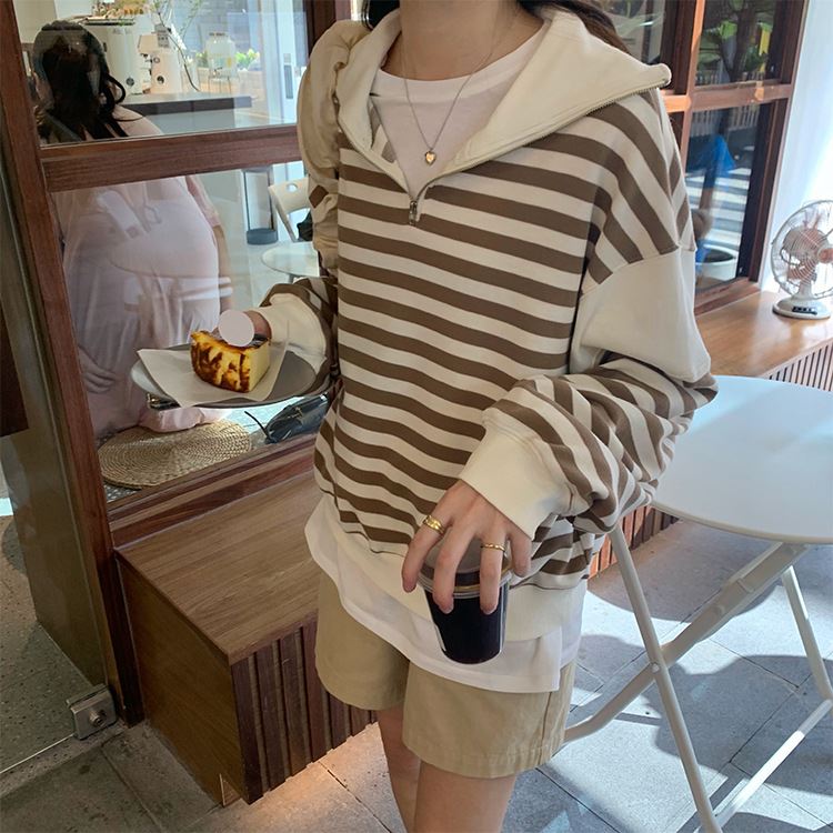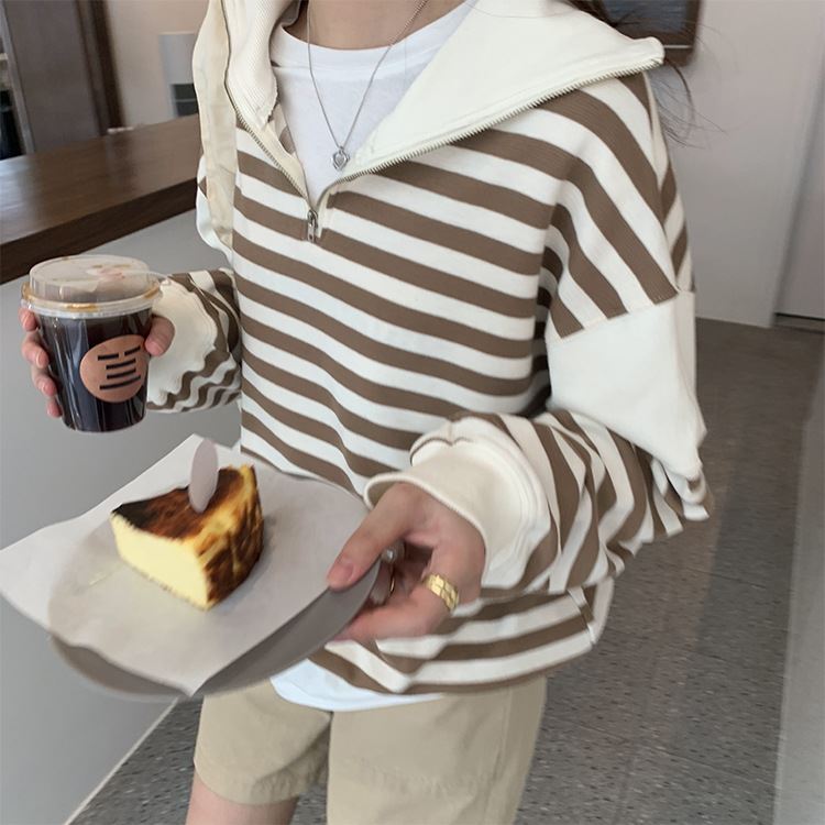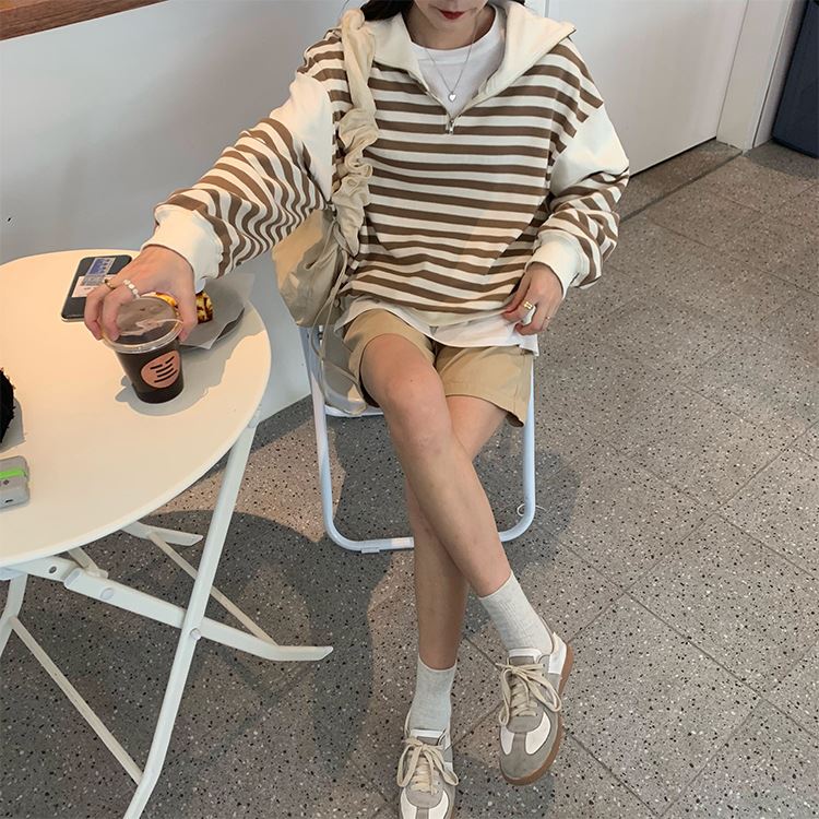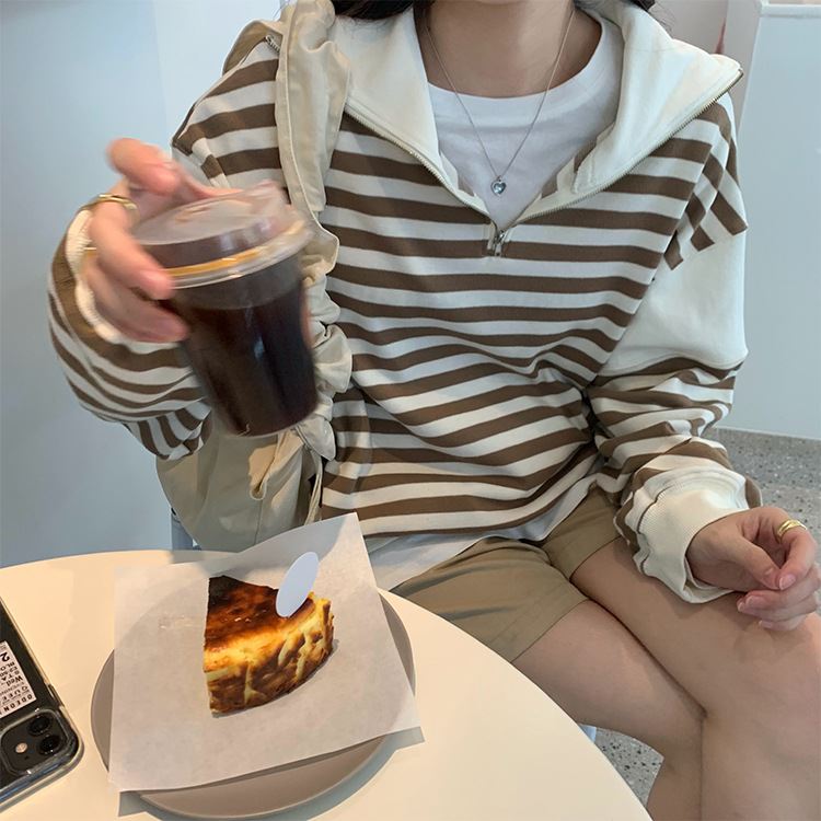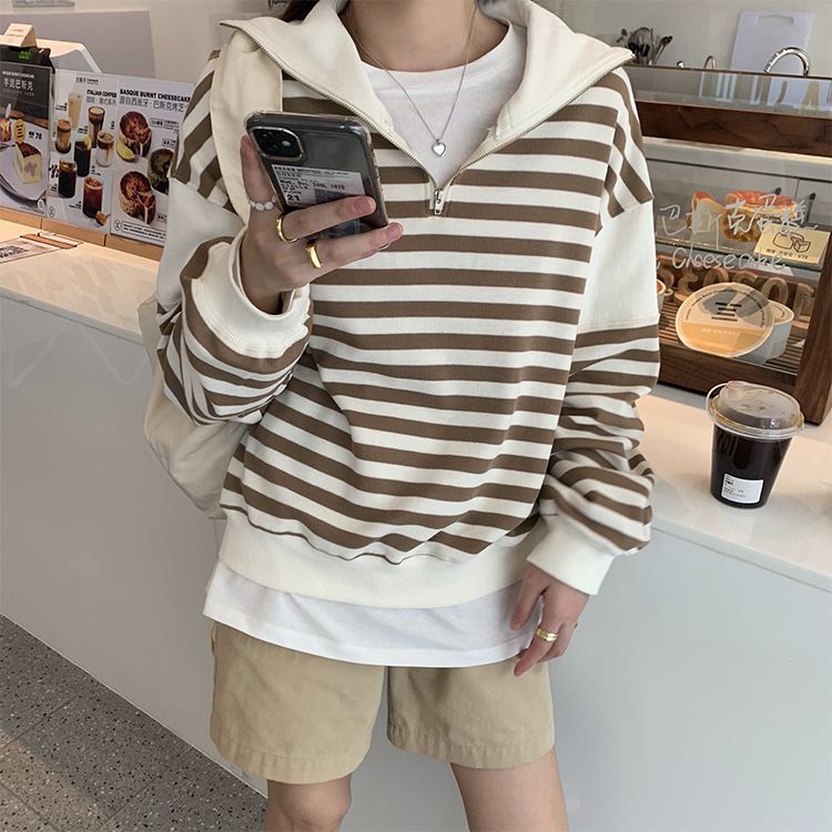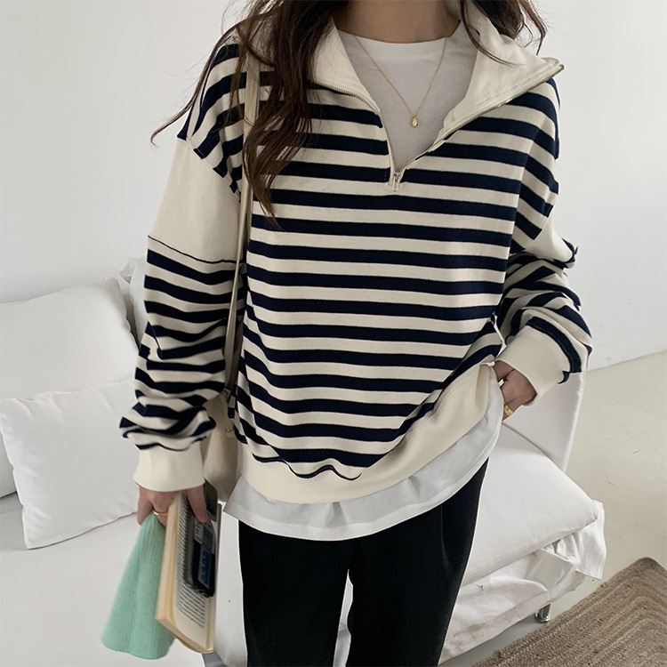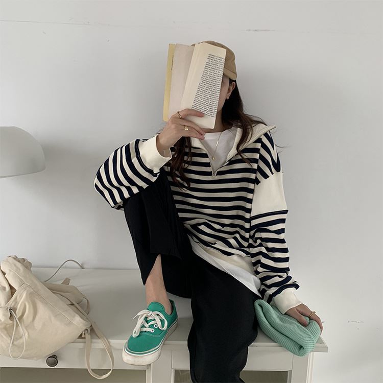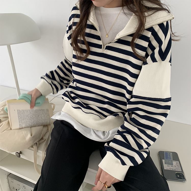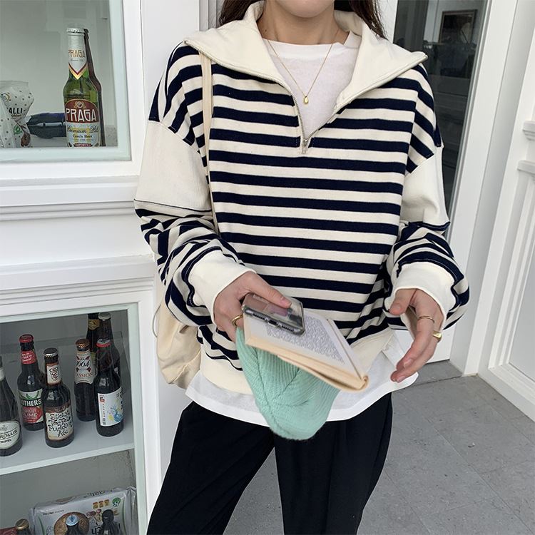 여성 하이넥 반집업 스트라이프 단가라 루즈핏 배색 맨투맨 2color