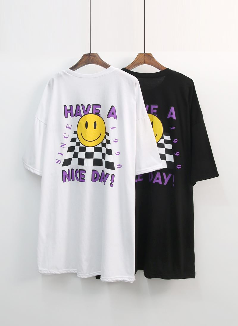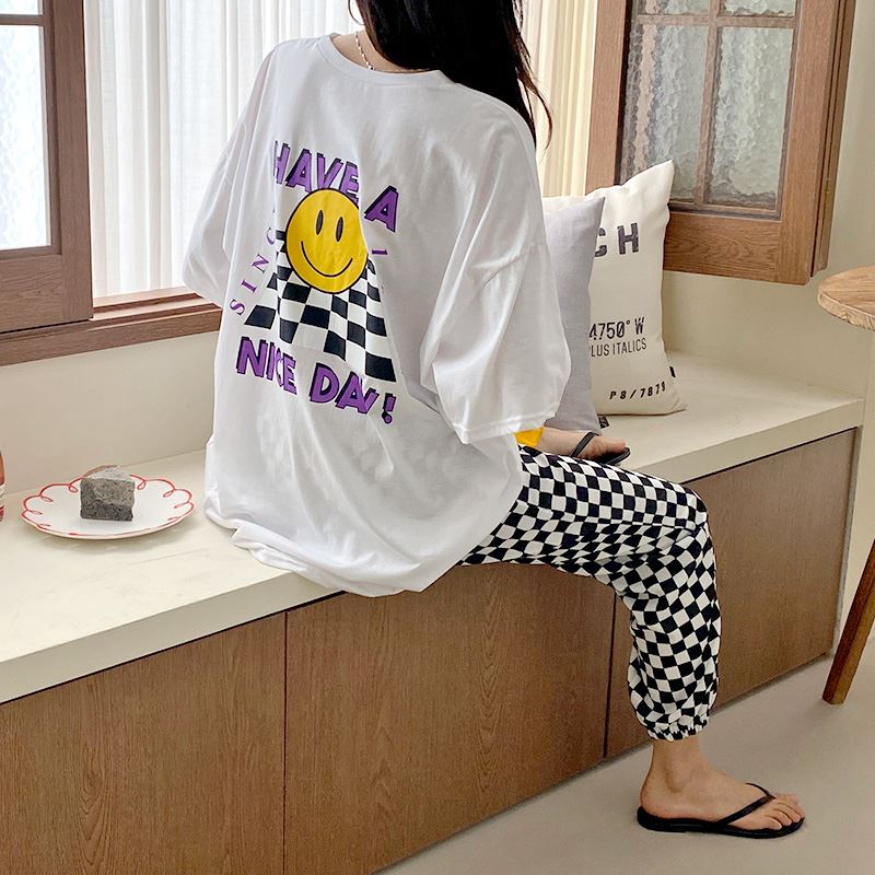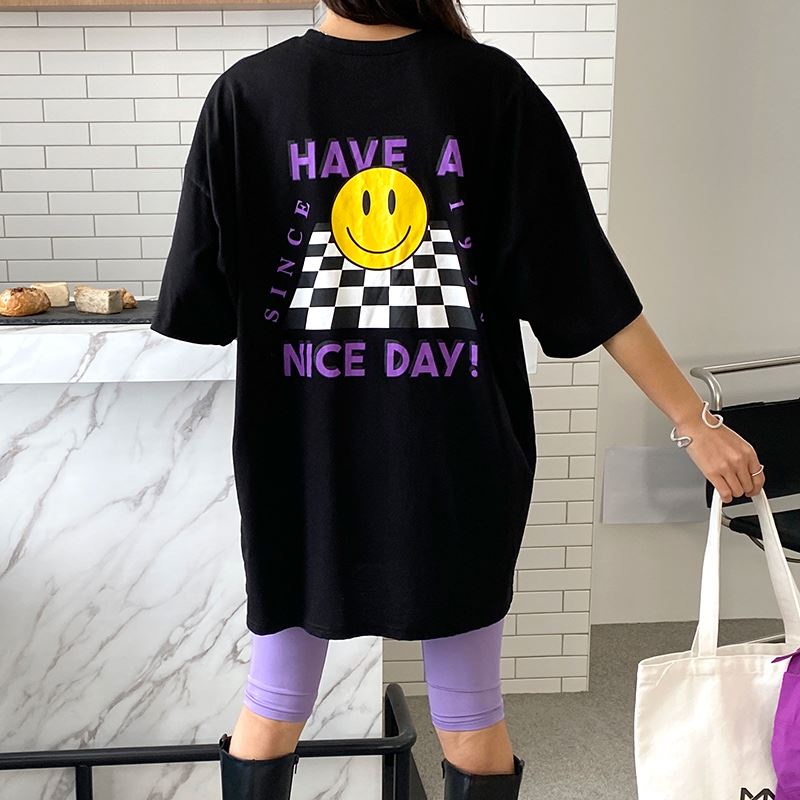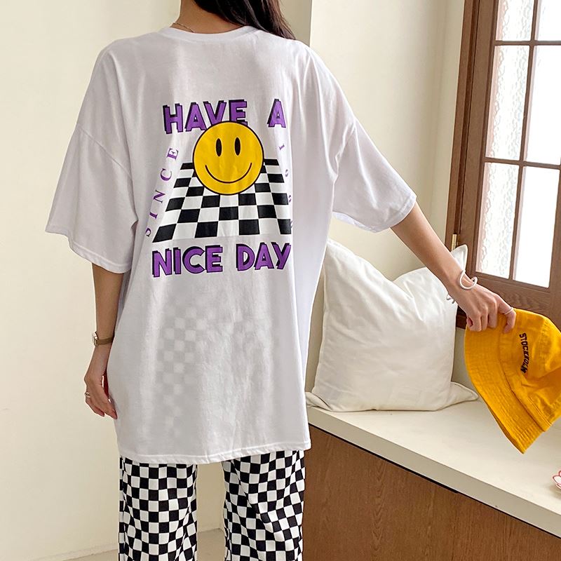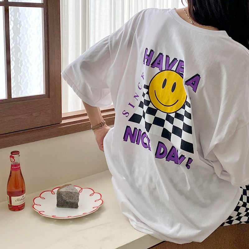 • 여성 스마일 반팔티 체크 디자인 데일리룩