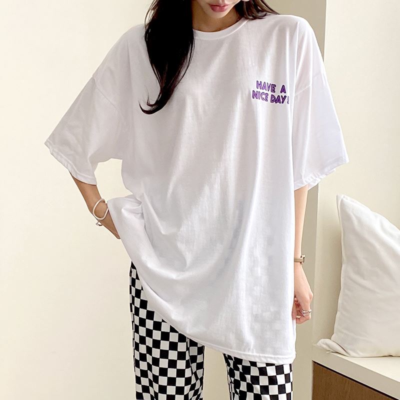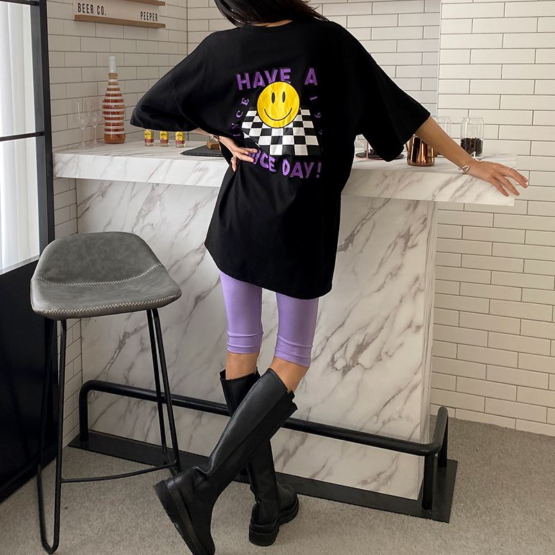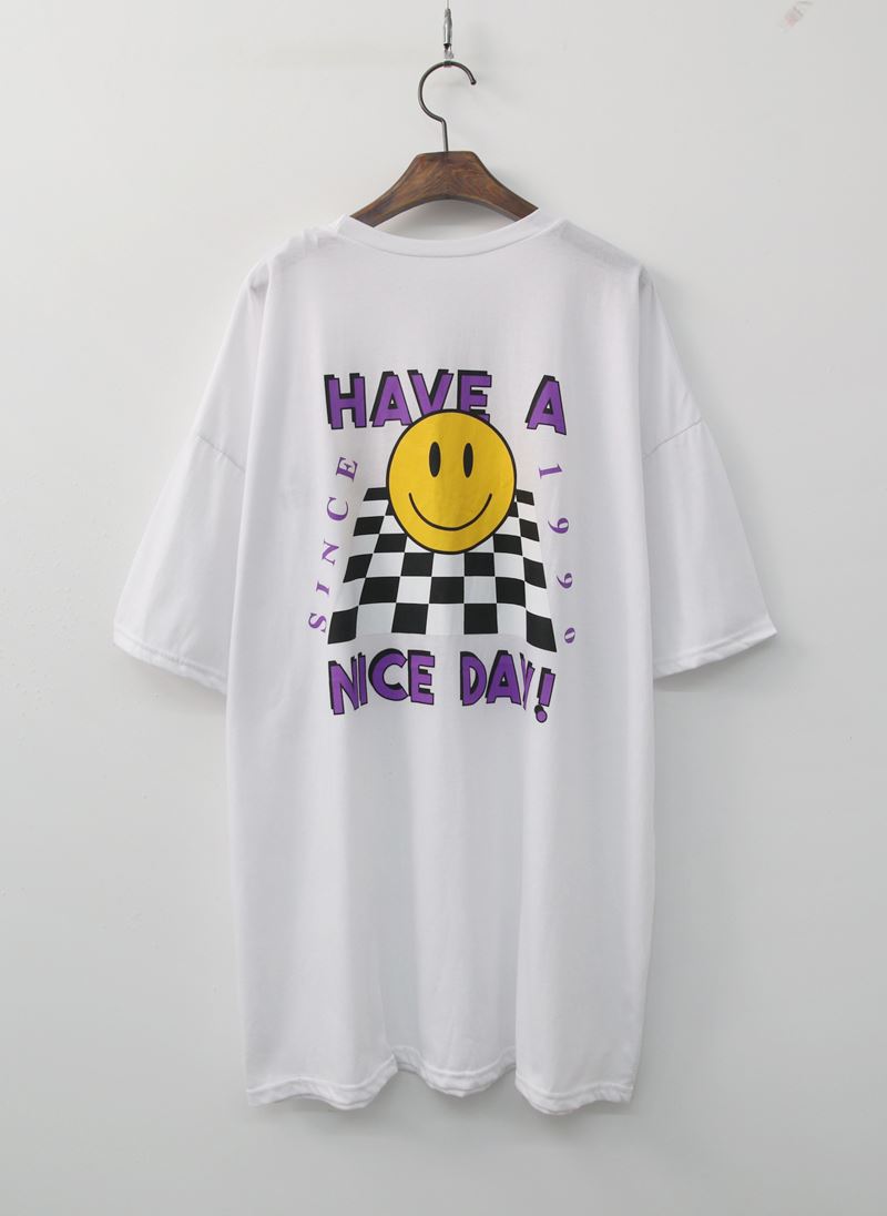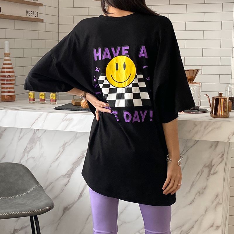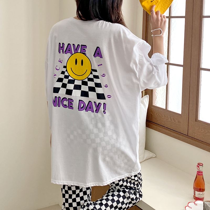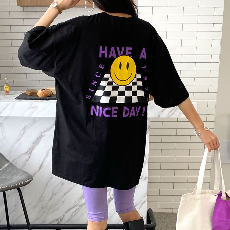 • 여성 스마일 반팔티 체크 디자인 데일리룩