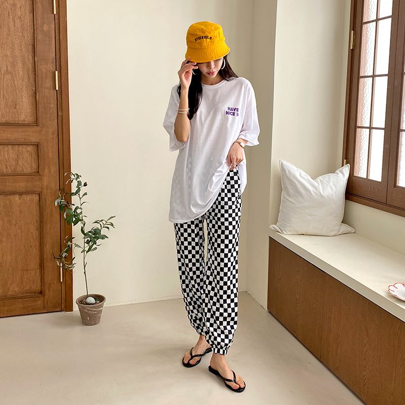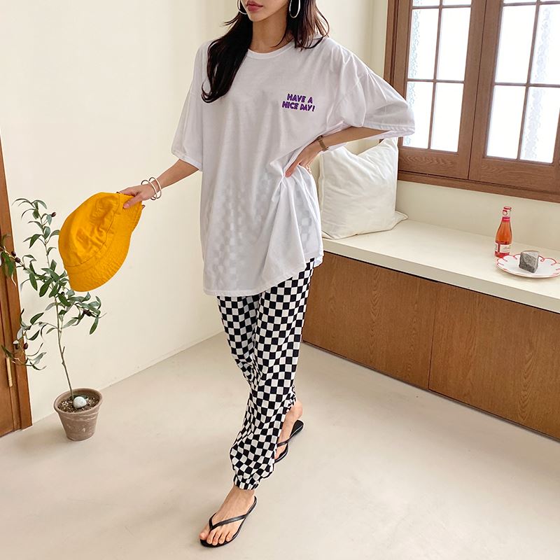 여성 스마일 반팔티 체크 디자인 데일리룩