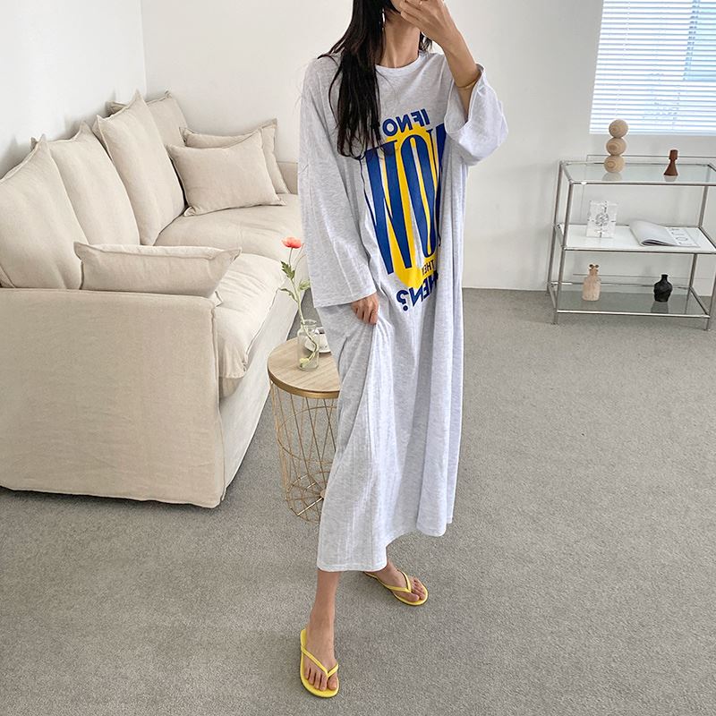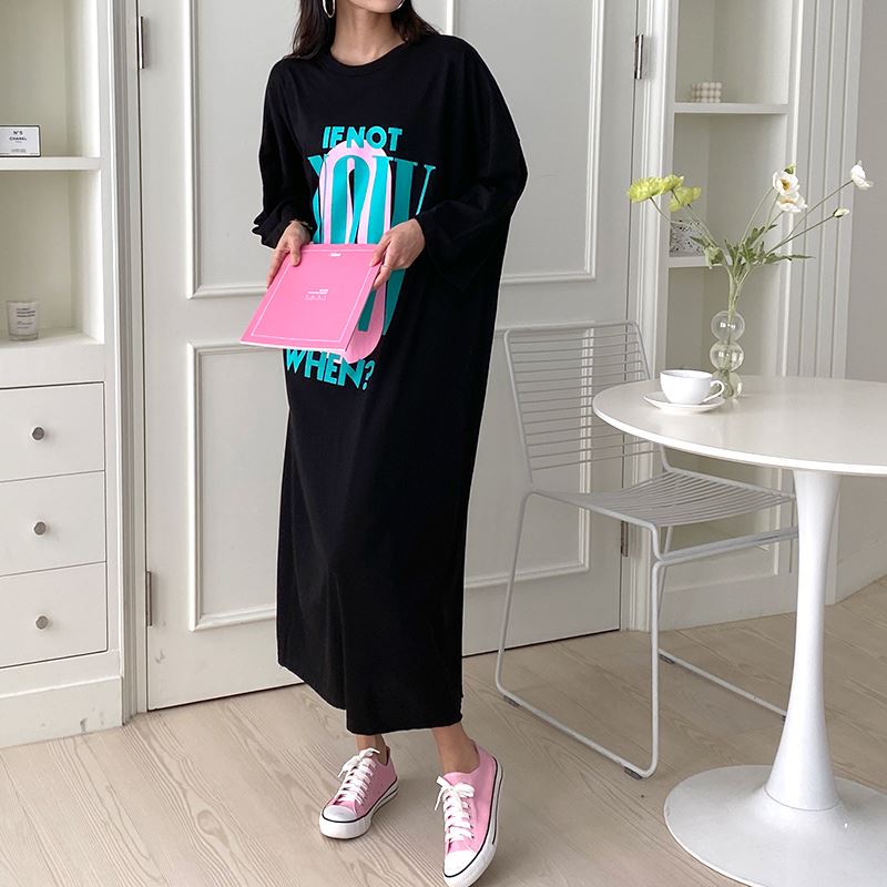 • 여성 데일리 롱 원피스 여름 긴팔 그래픽 레터링