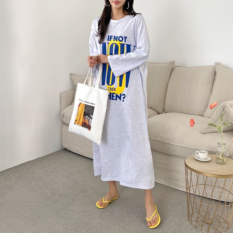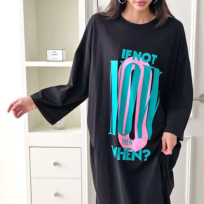 레터링 그래픽으로 디자인 된 원피스는 일상복이나 데일리 무드로