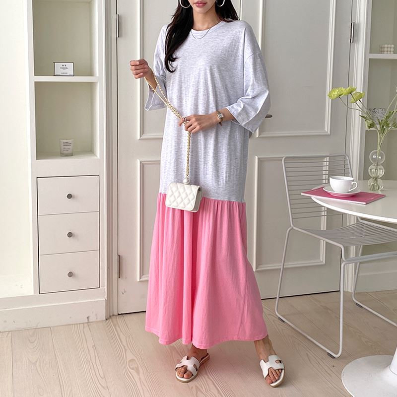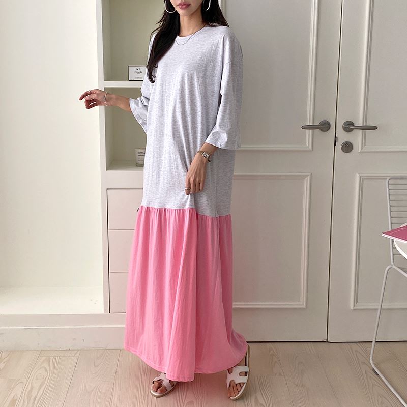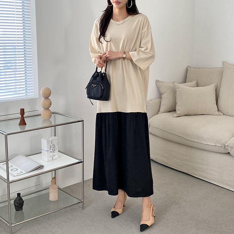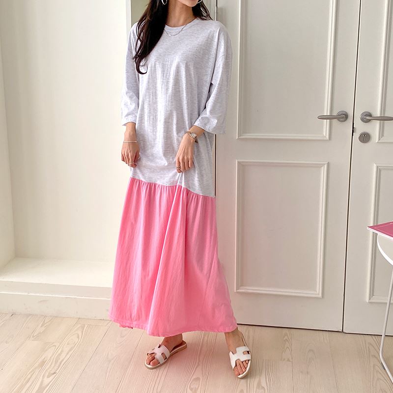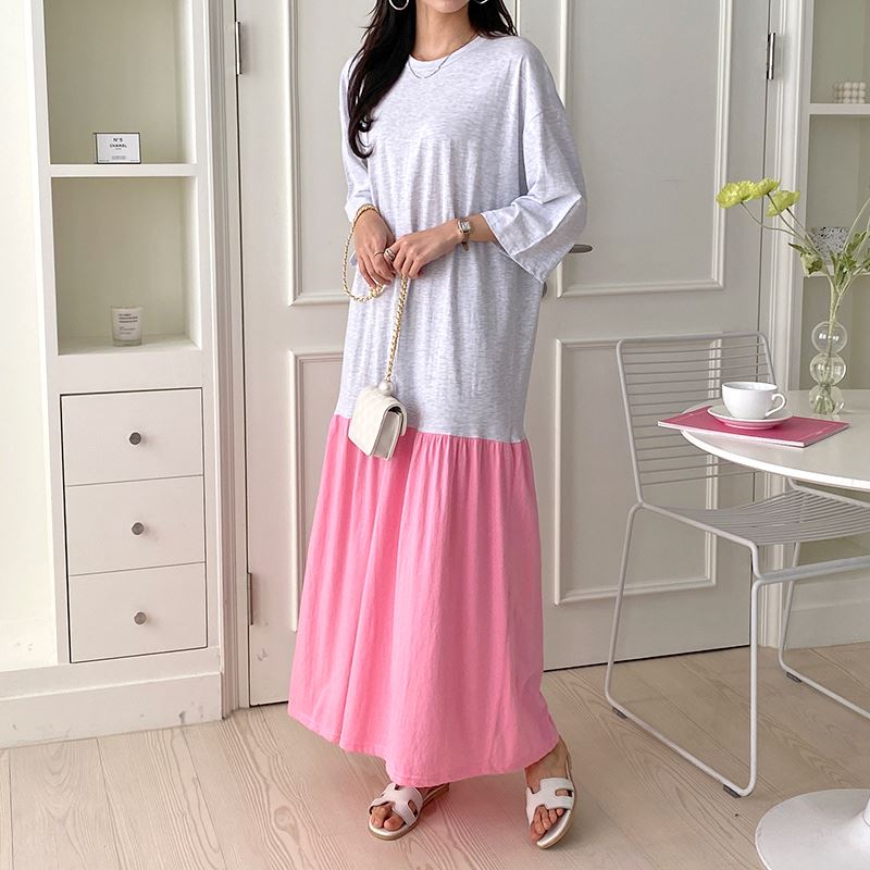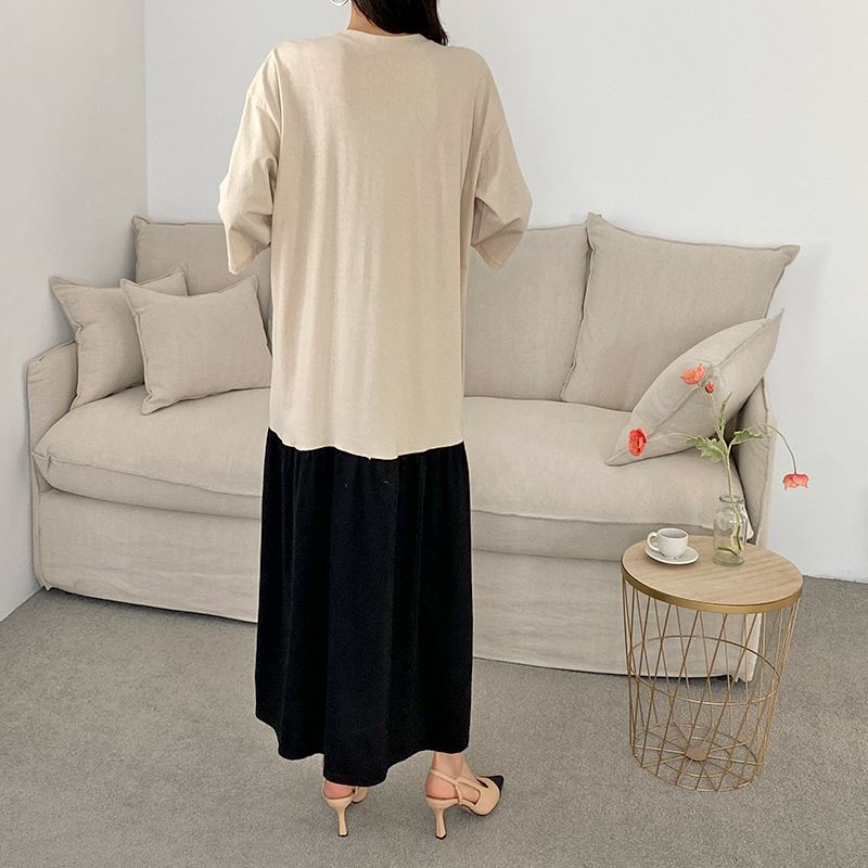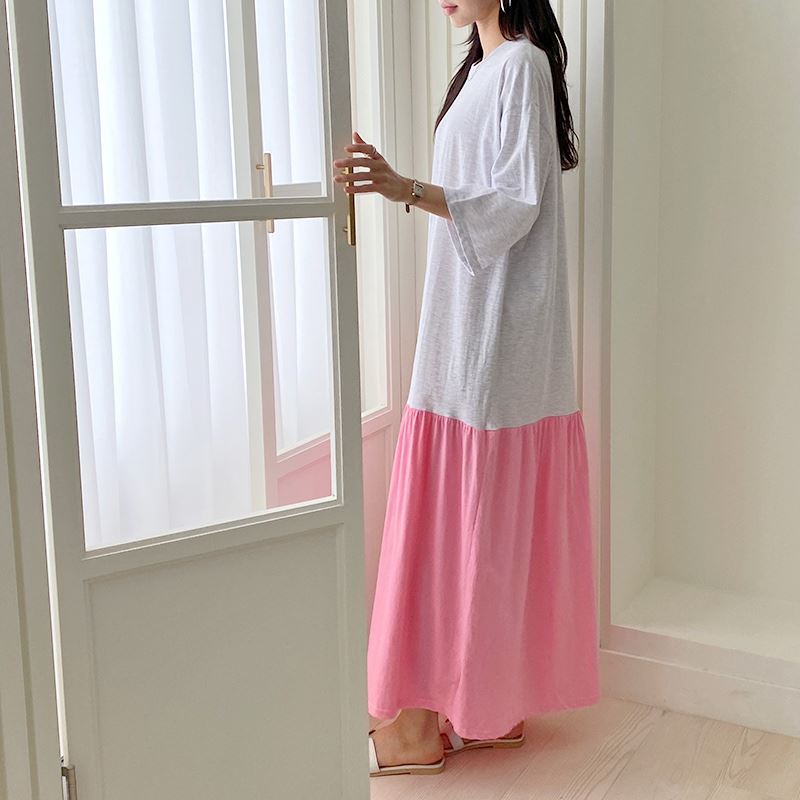 • 여성 여름 롱 원피스 긴팔 배색 썸머룩