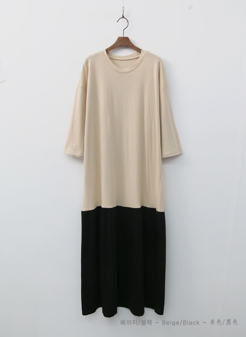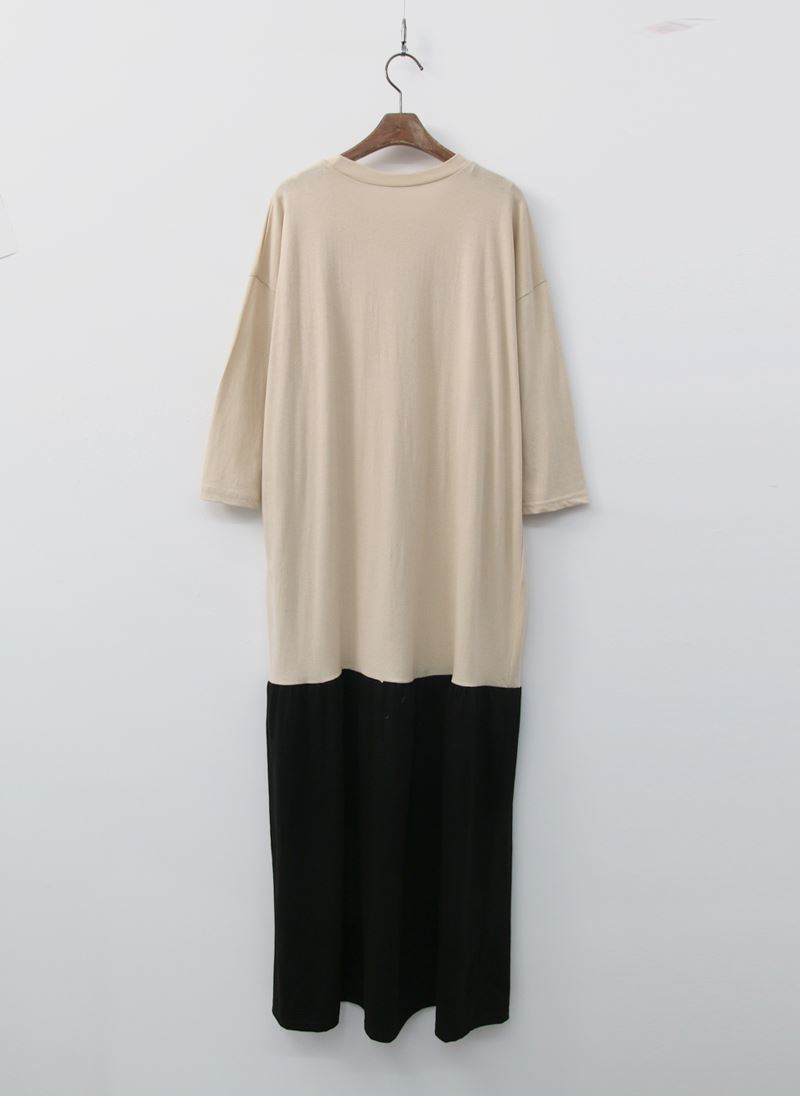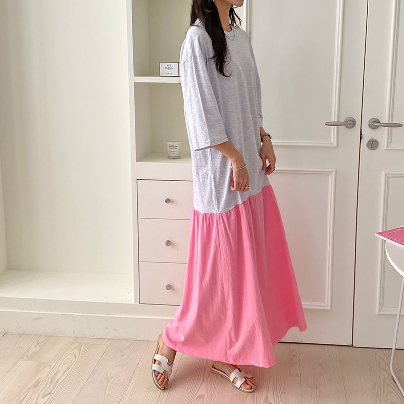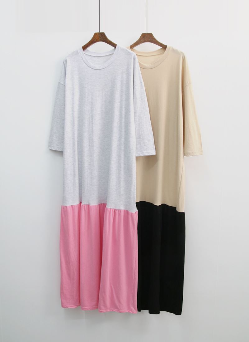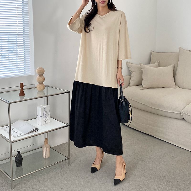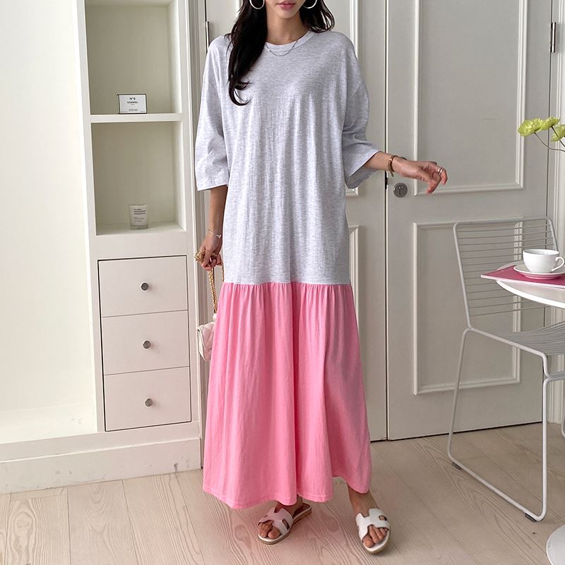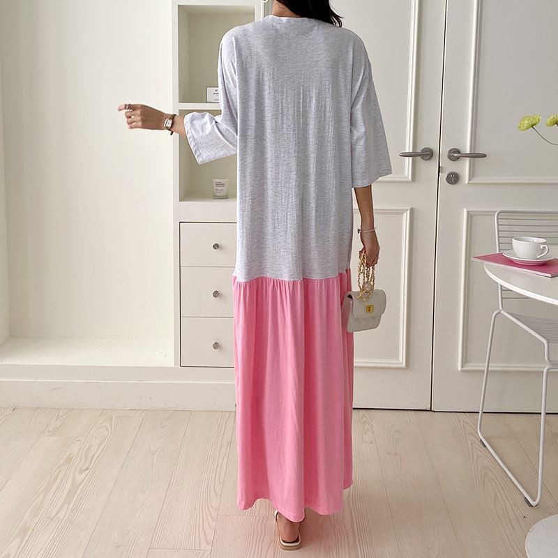 • 여성 여름 롱 원피스 긴팔 배색 썸머룩