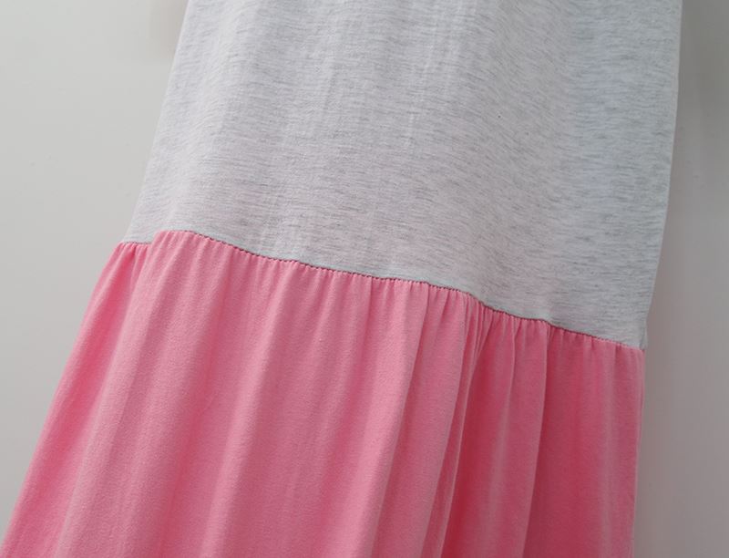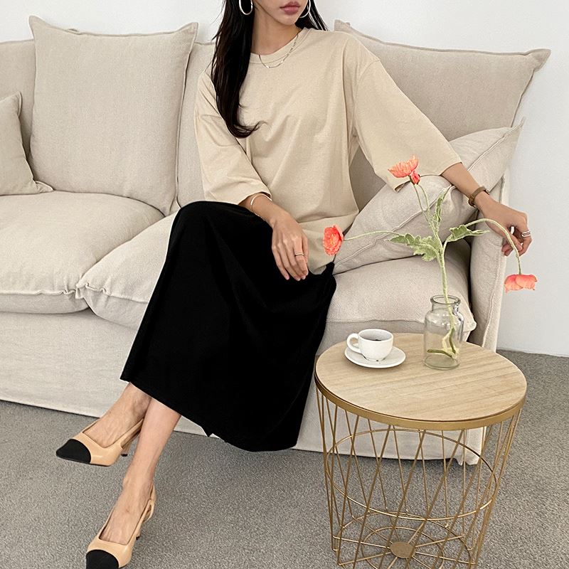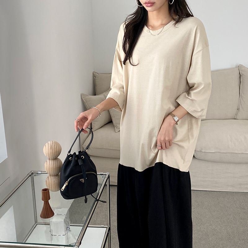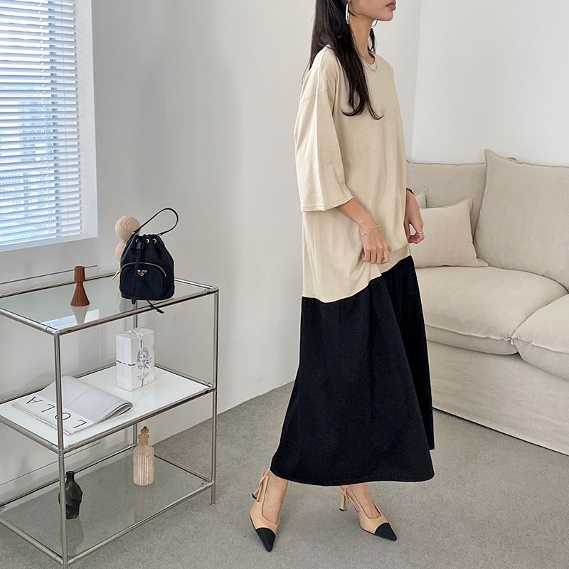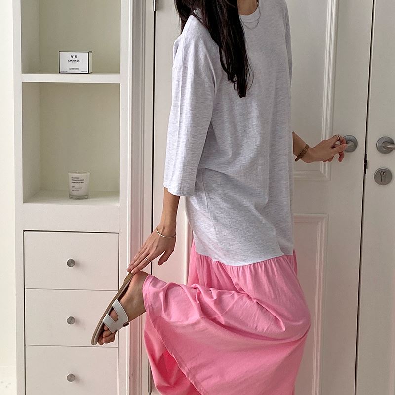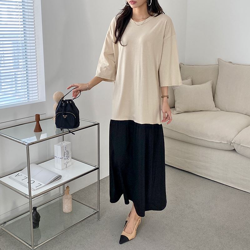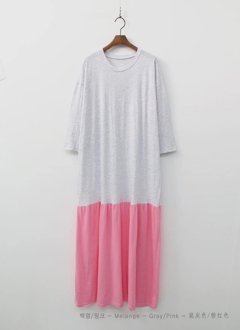 • 여성 여름 롱 원피스 긴팔 배색 썸머룩