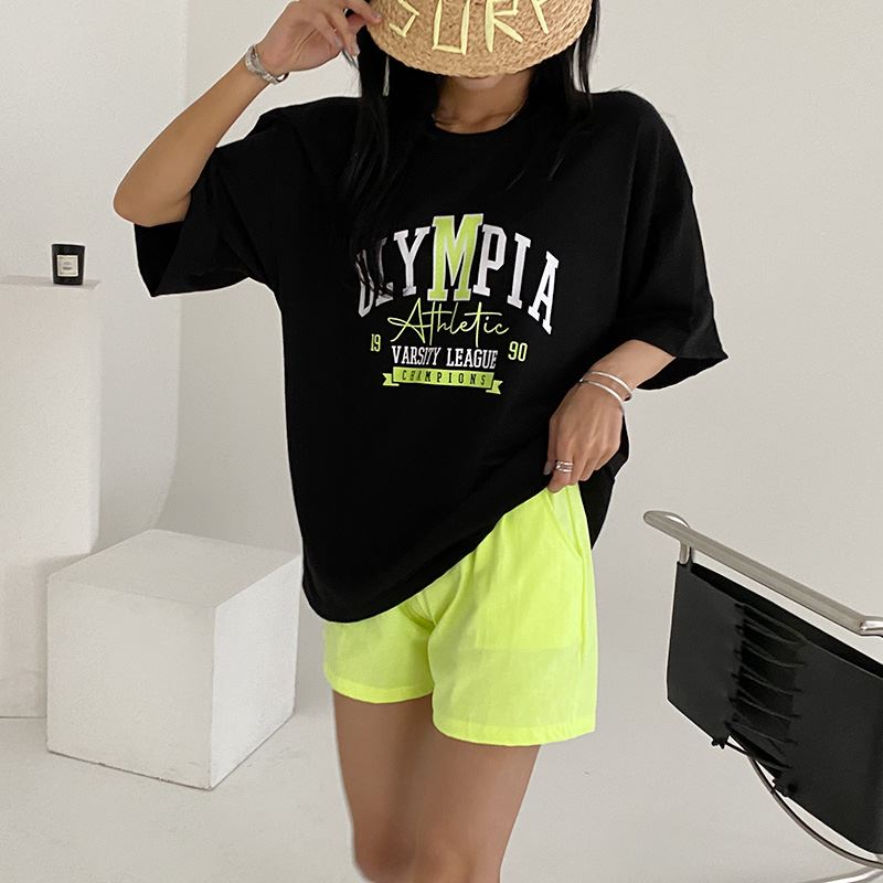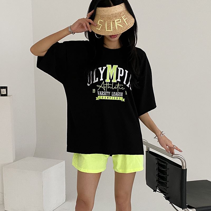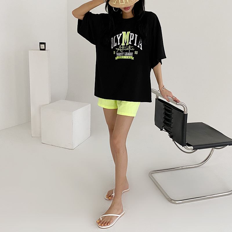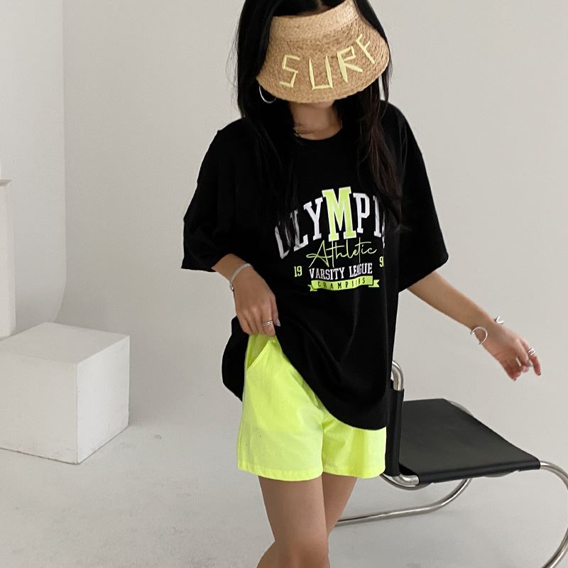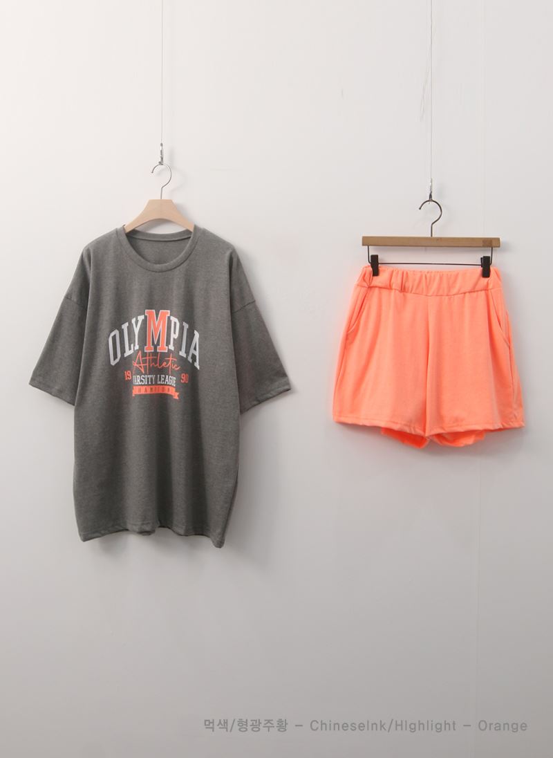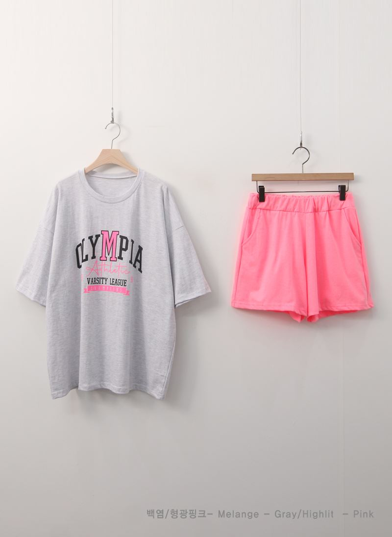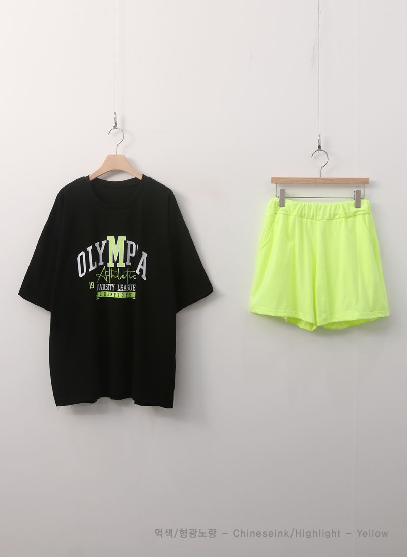 • 여자 반바지 여름 셋업 트레이닝 세트 형광 반팔티셔츠(올림형광-SET)