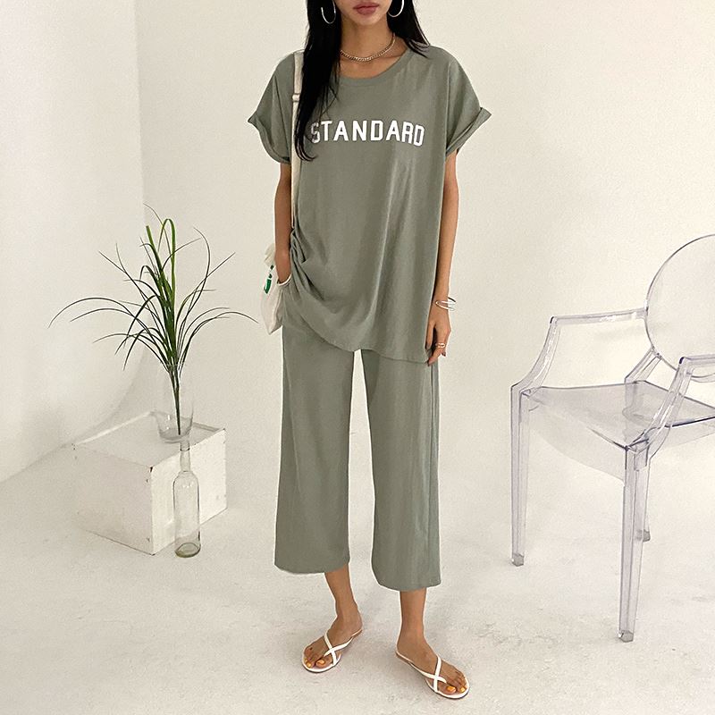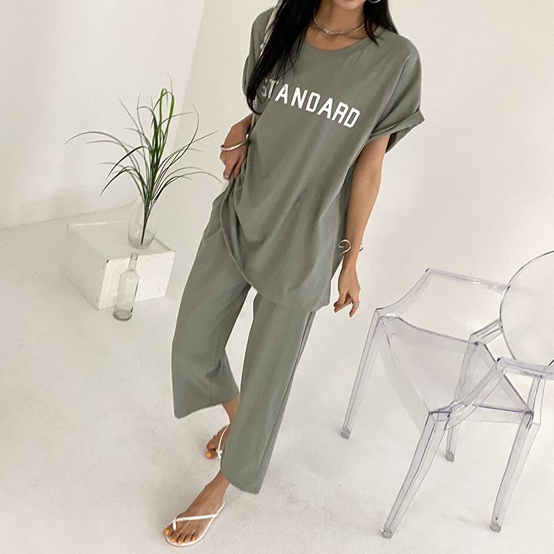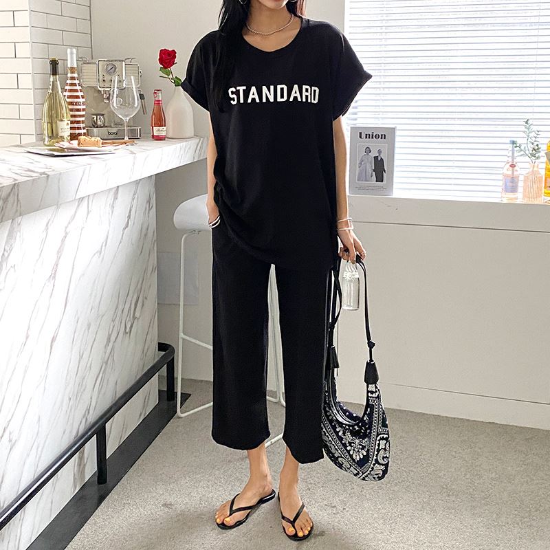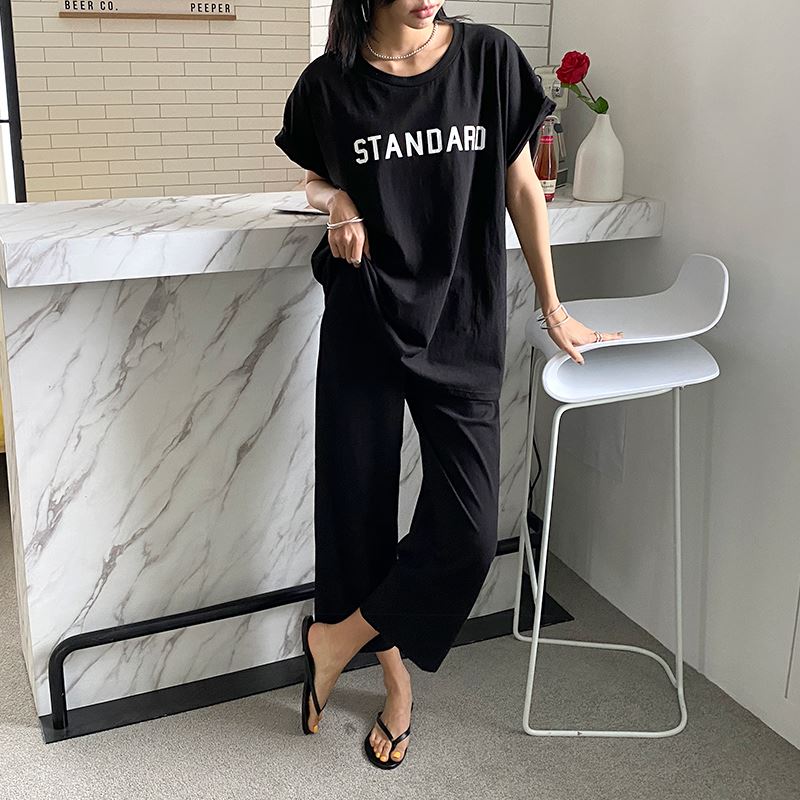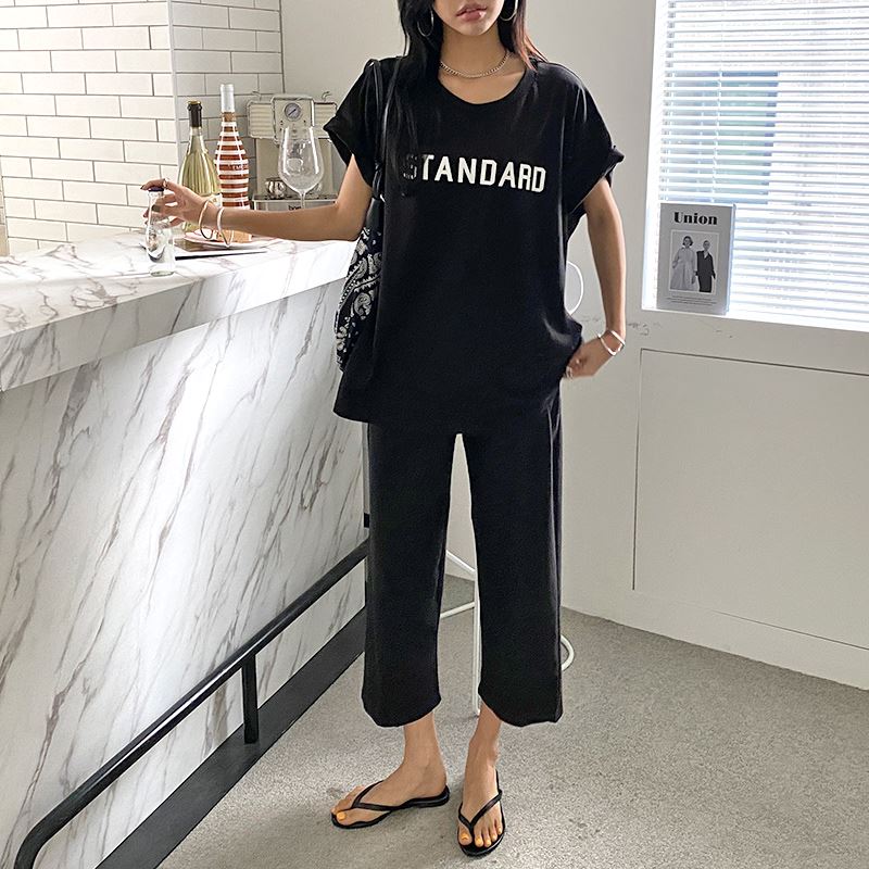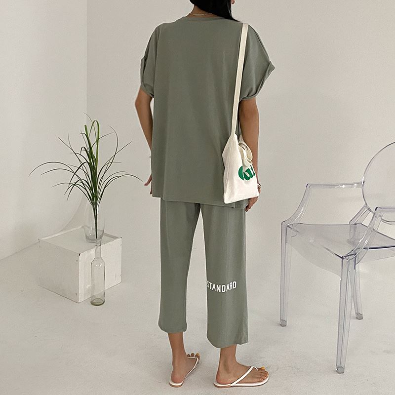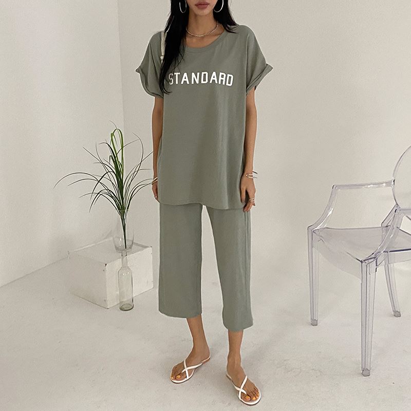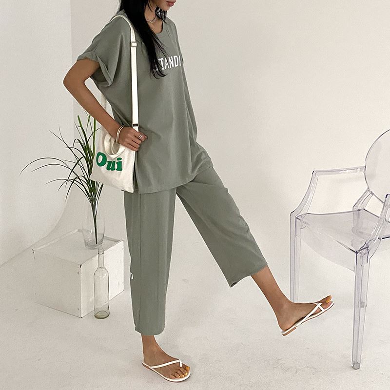 여성 빈티지 상하세트 롤업 반팔 밴딩 팬츠 편안한 코디