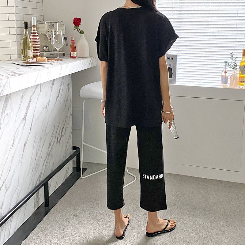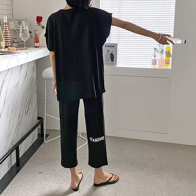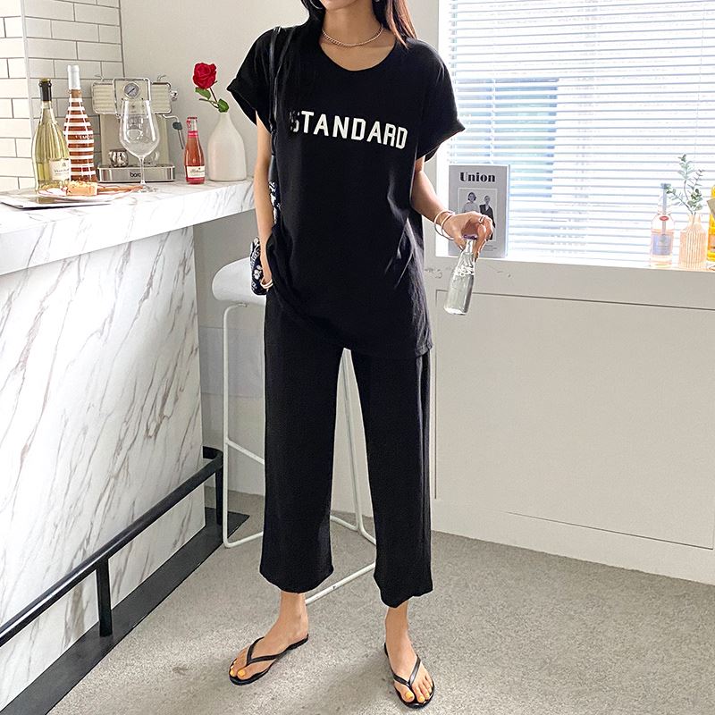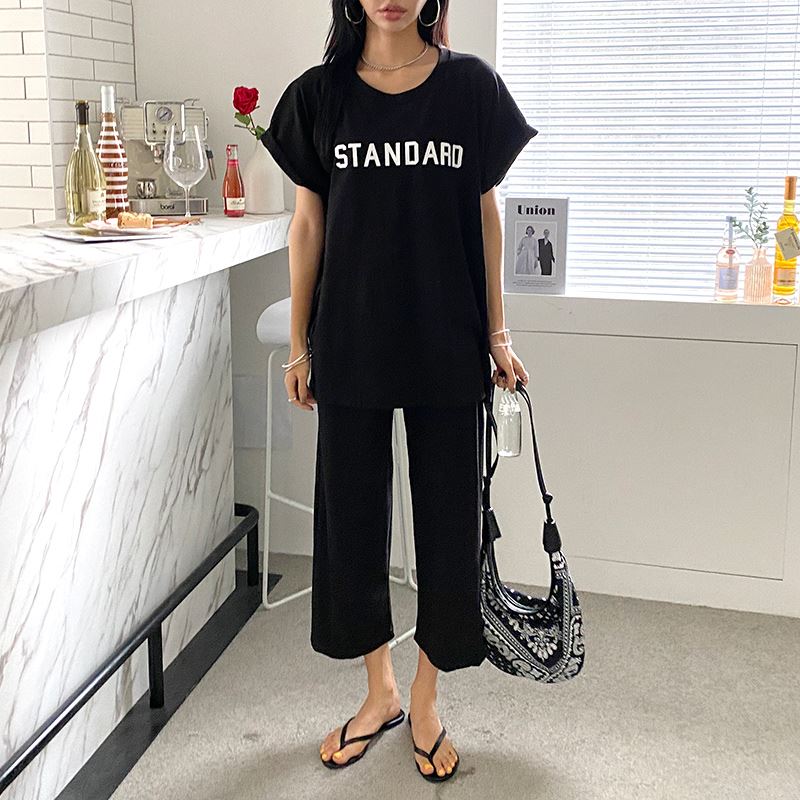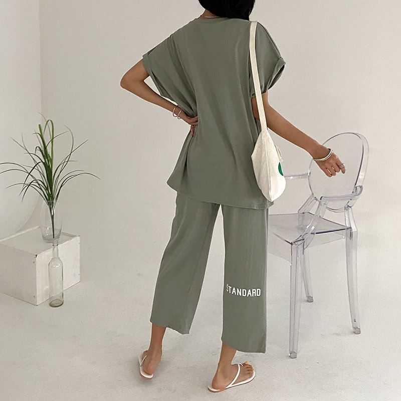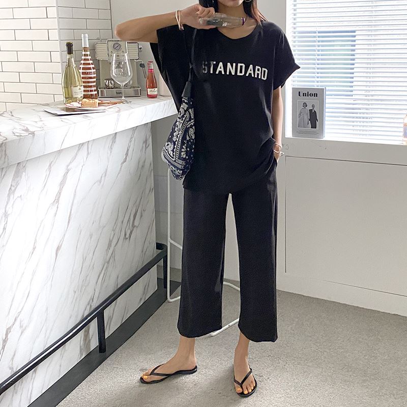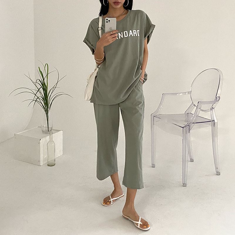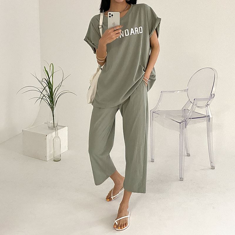 여성 빈티지 상하세트 롤업 반팔 밴딩 팬츠 편안한 코디