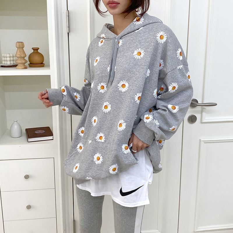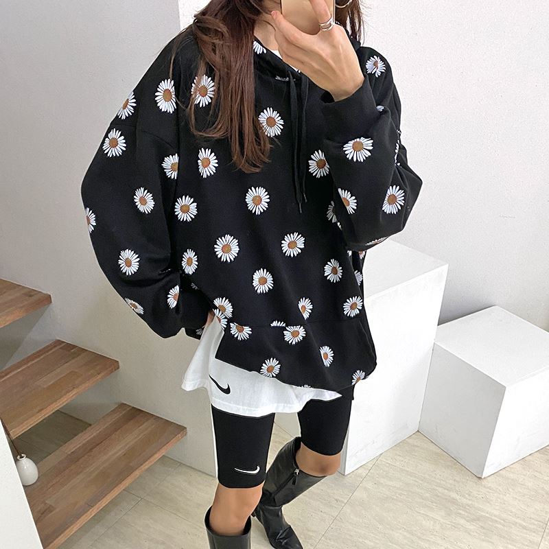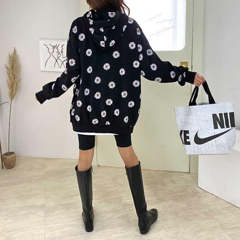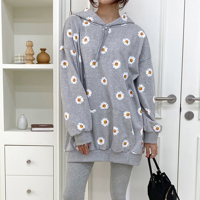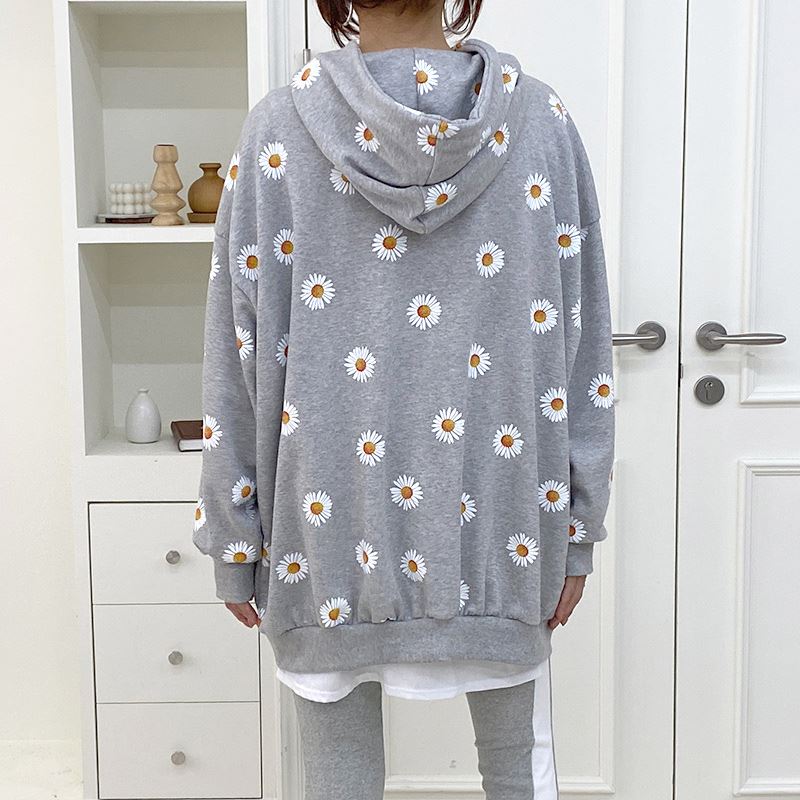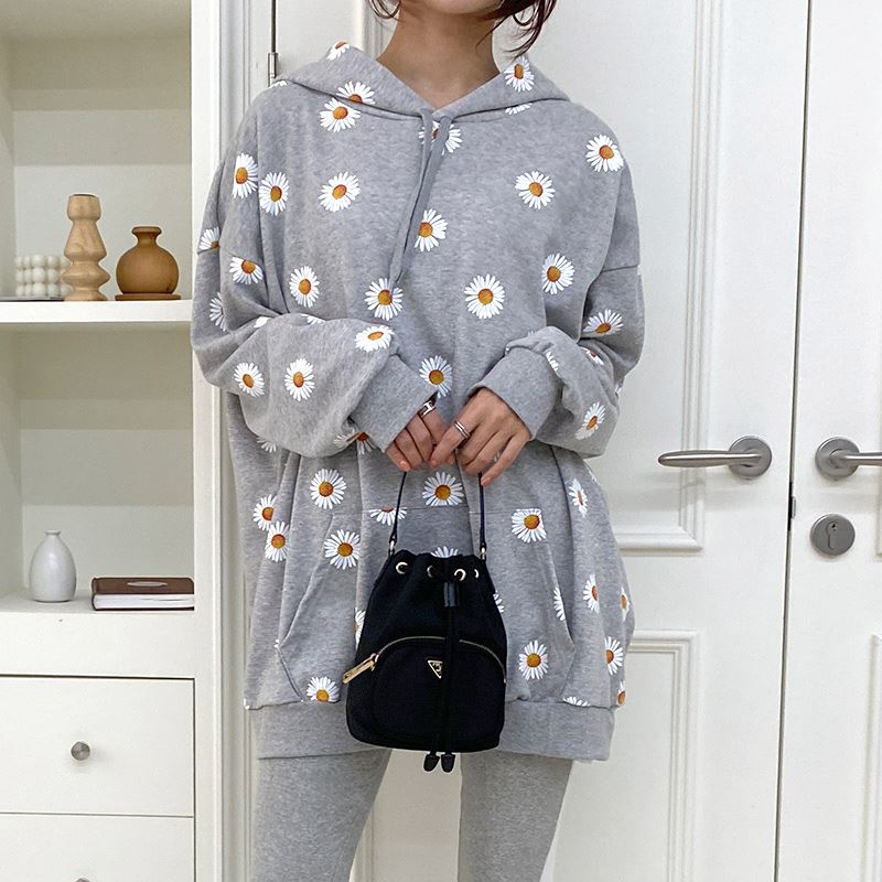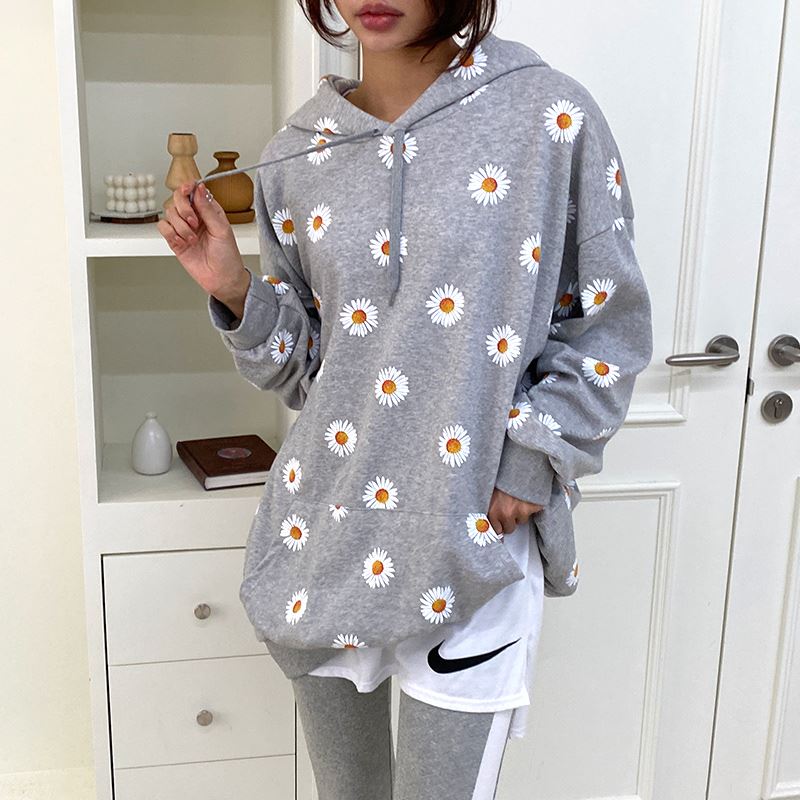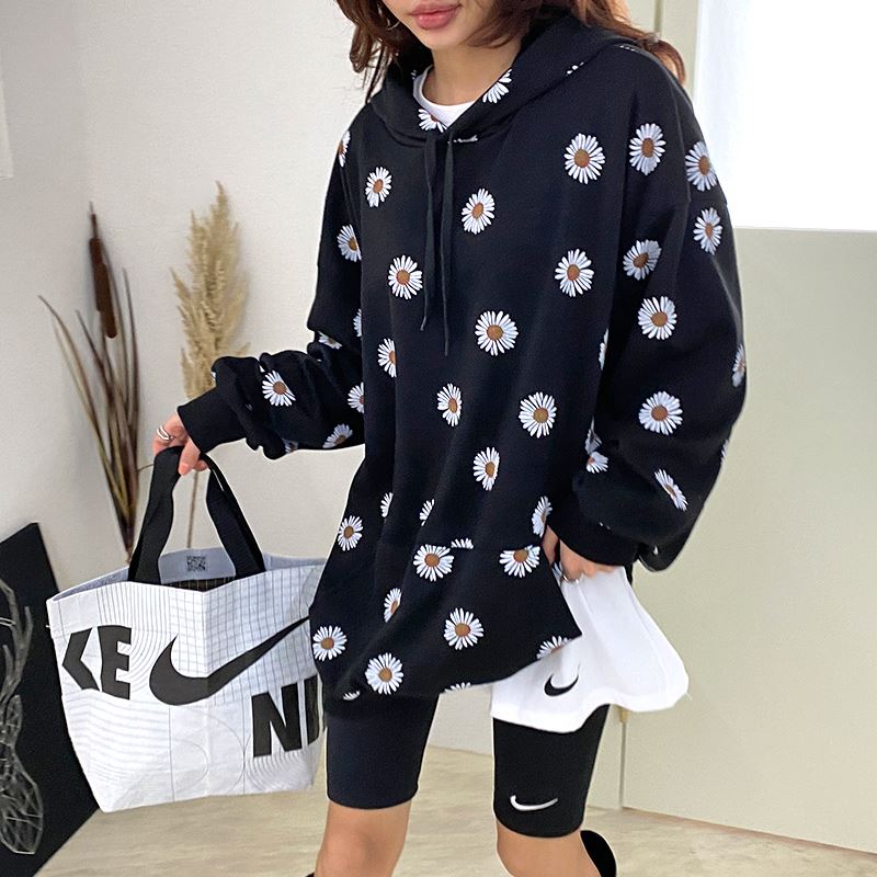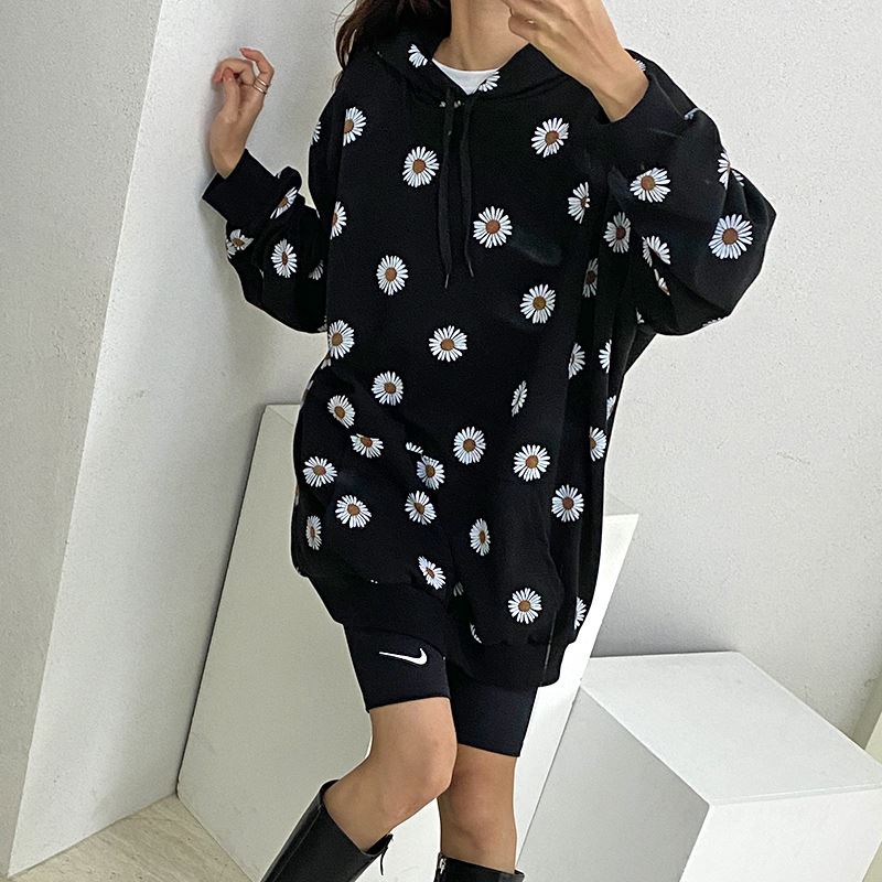 여자 가을겨울 포켓 후드 티셔츠 플라워 패턴 오버핏