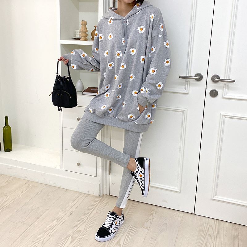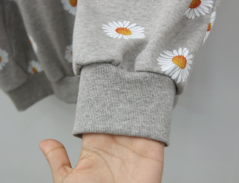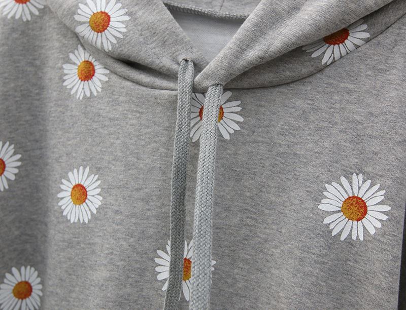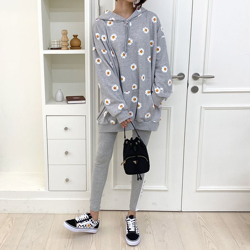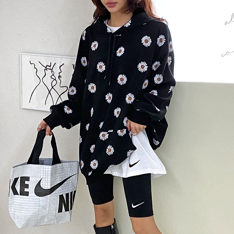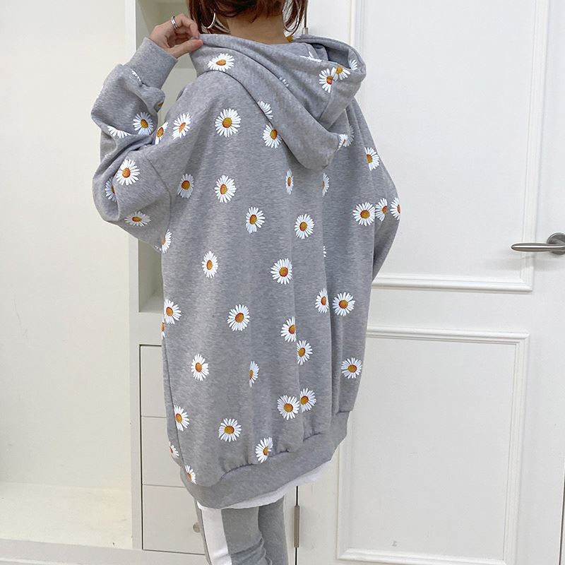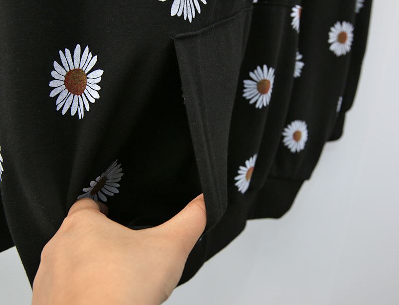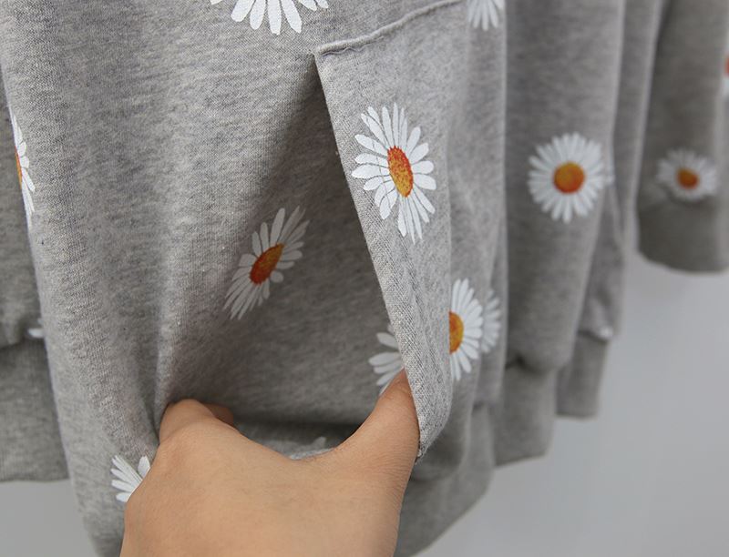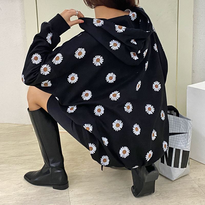 여자 가을겨울 포켓 후드 티셔츠 플라워 패턴 오버핏