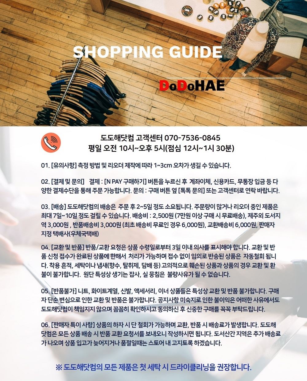 세탁방법 및 취급 시 주의사항 도도해닷컴의 모든 제품은 첫 세탁 시 드라이 크리닝을 권장합니다.