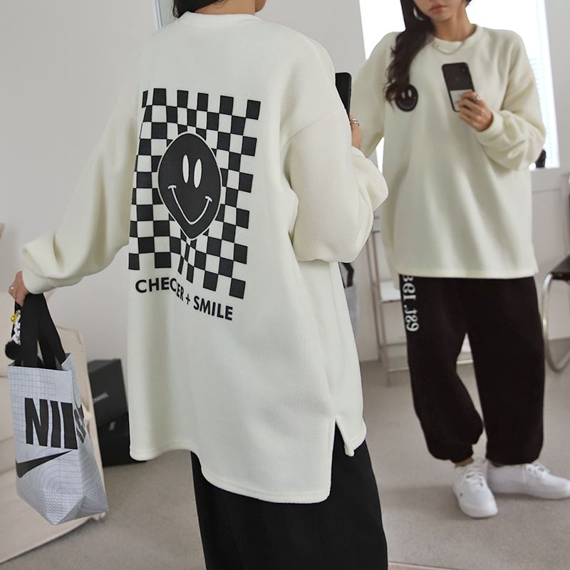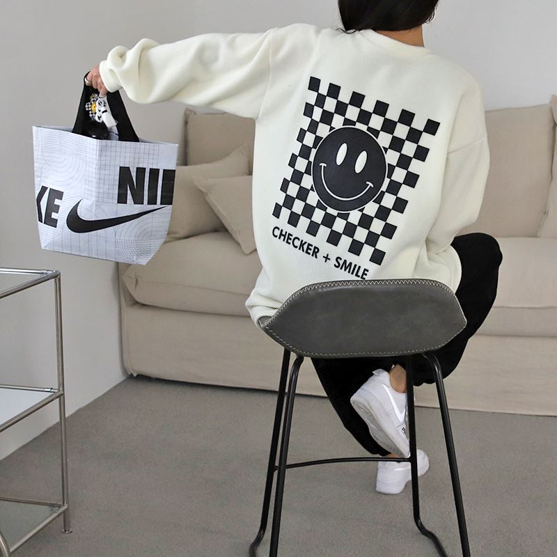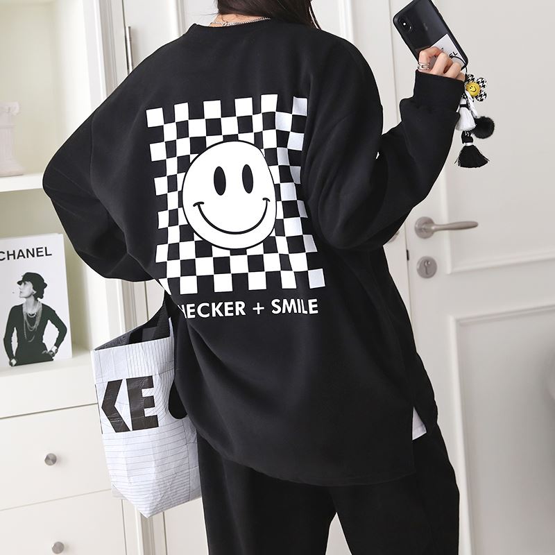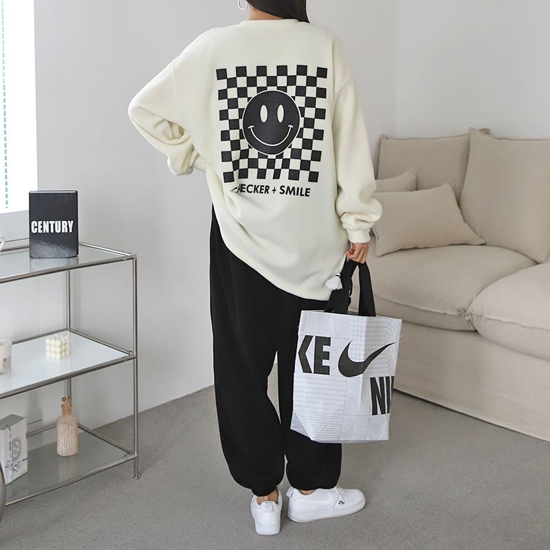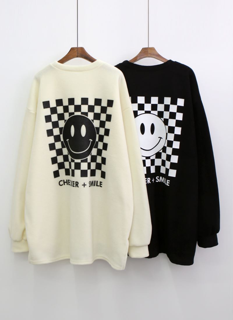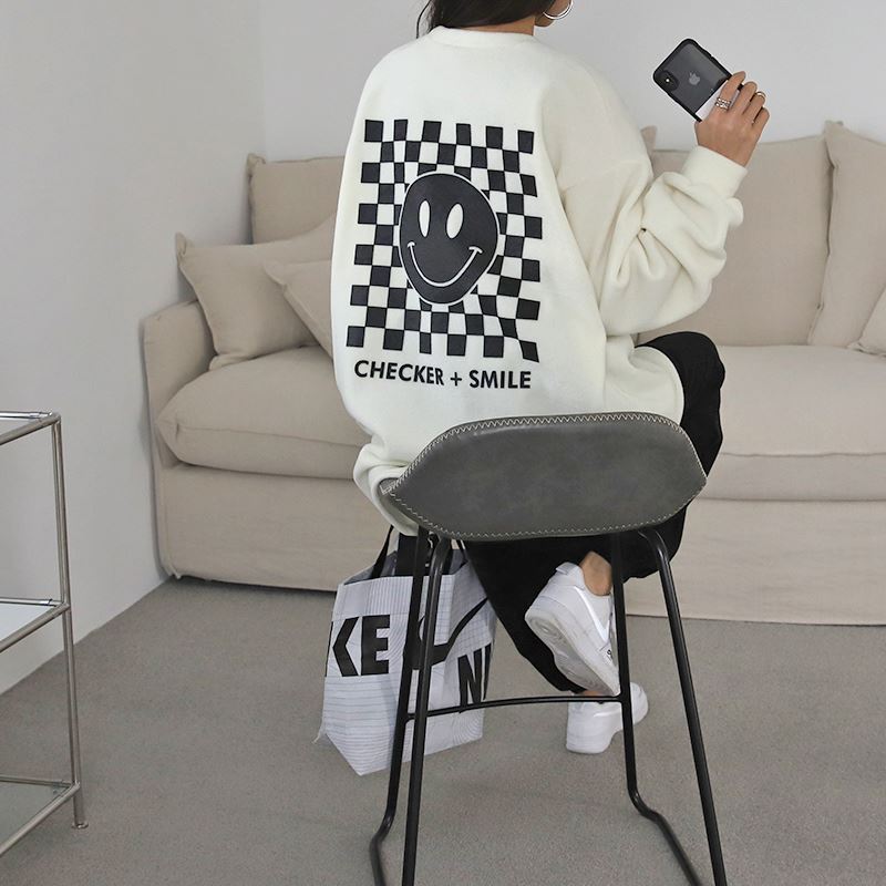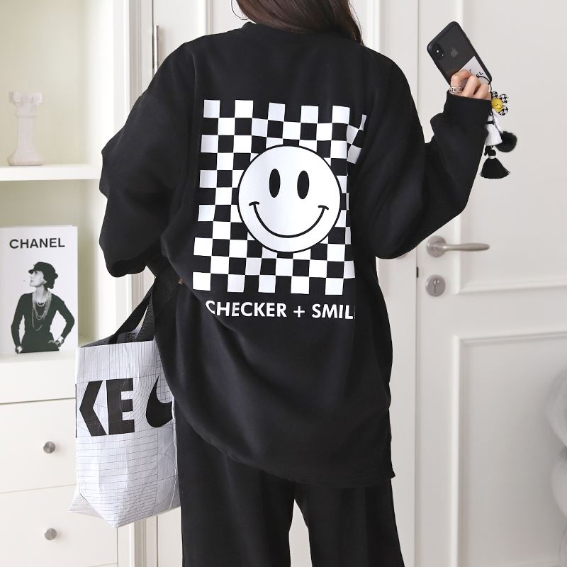 넉넉한 루즈핏으로 힙하게 입을 수 있고 체스 패턴과 스마일 로고를 통해 세련미를 더했어요.