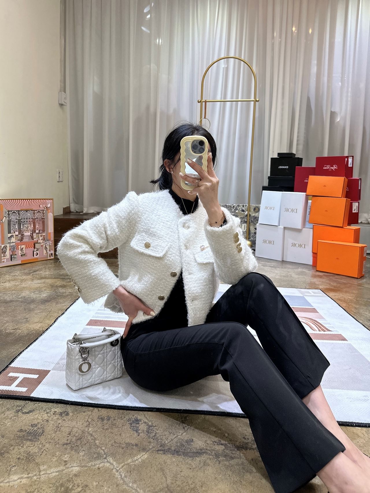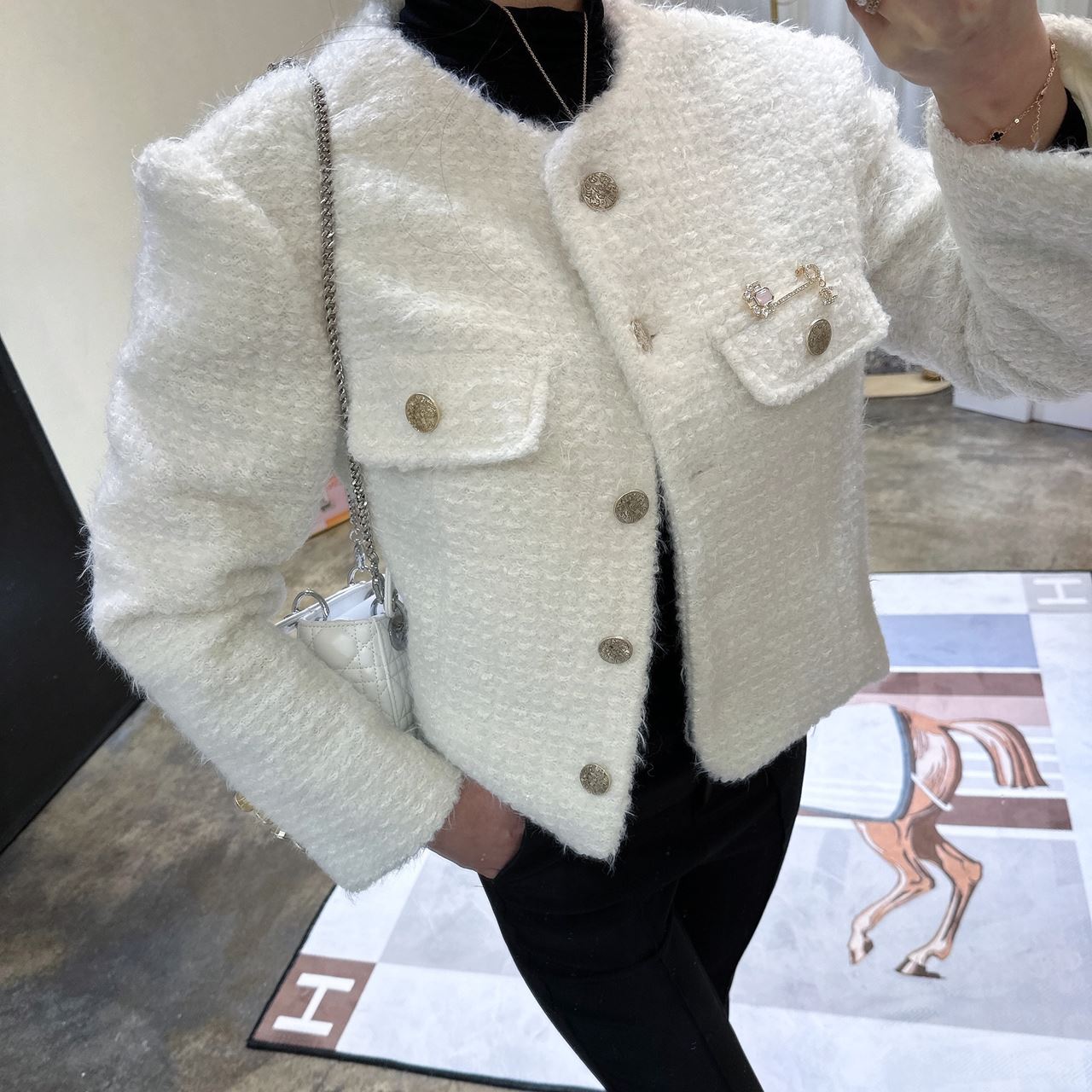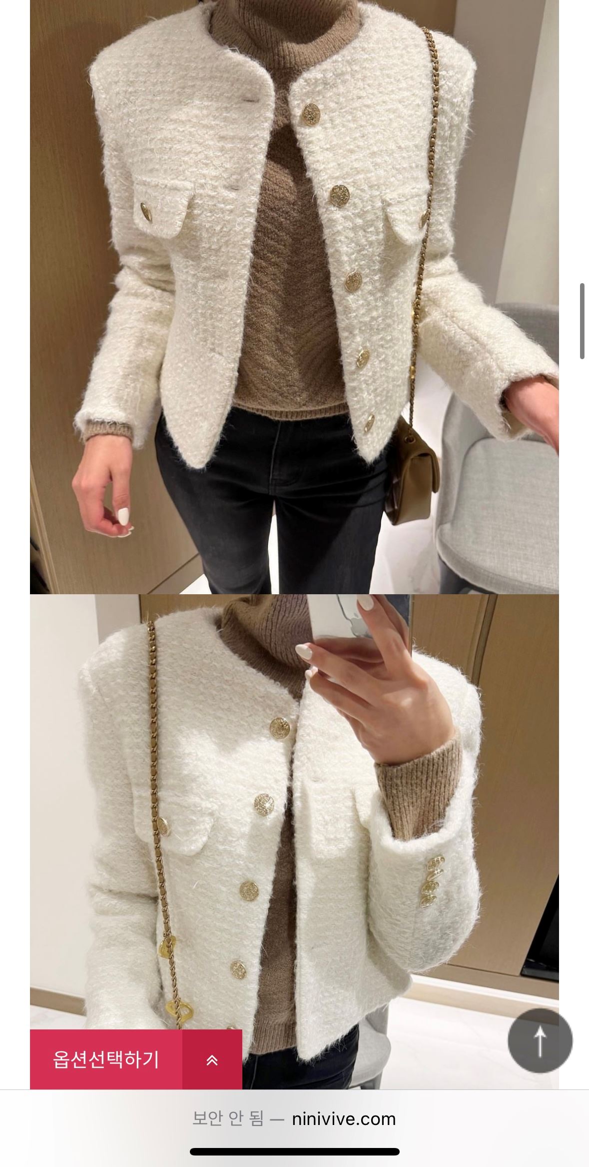 정면 프론트 핀턱 디자인과 함께 살짝 숏기장으로 시각적으로 다리가 길어보이는 효과까지 만들어주는 트위드 자켓으로,