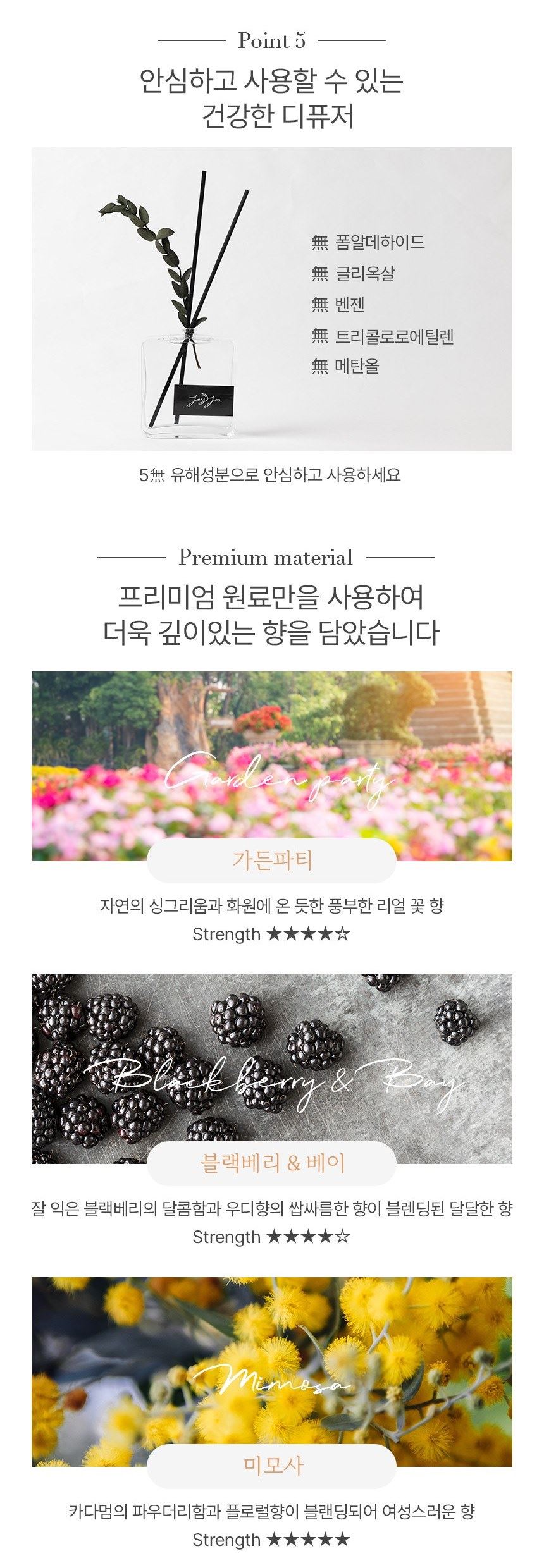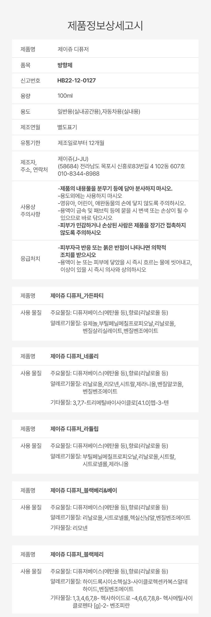 | 제품에 사용된 화학 물질 명칭 | 주요물질:디퓨저베이스(에탄올 등),향료(리날로올 등) 알레르기물질:쿠마린,부틸페닐메칠프로피오날,리날로올,알파-이소메칠이오논,헥실신남알 |