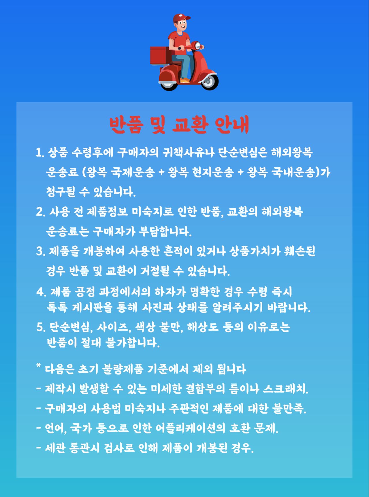 단순 변심에 의한 교환 / 반품은 현지왕복배송 + 국제운송 + 국내배송 등 제반 비용이 구매자에게 부과되오니 주문전에 반드시 확인해주세요.