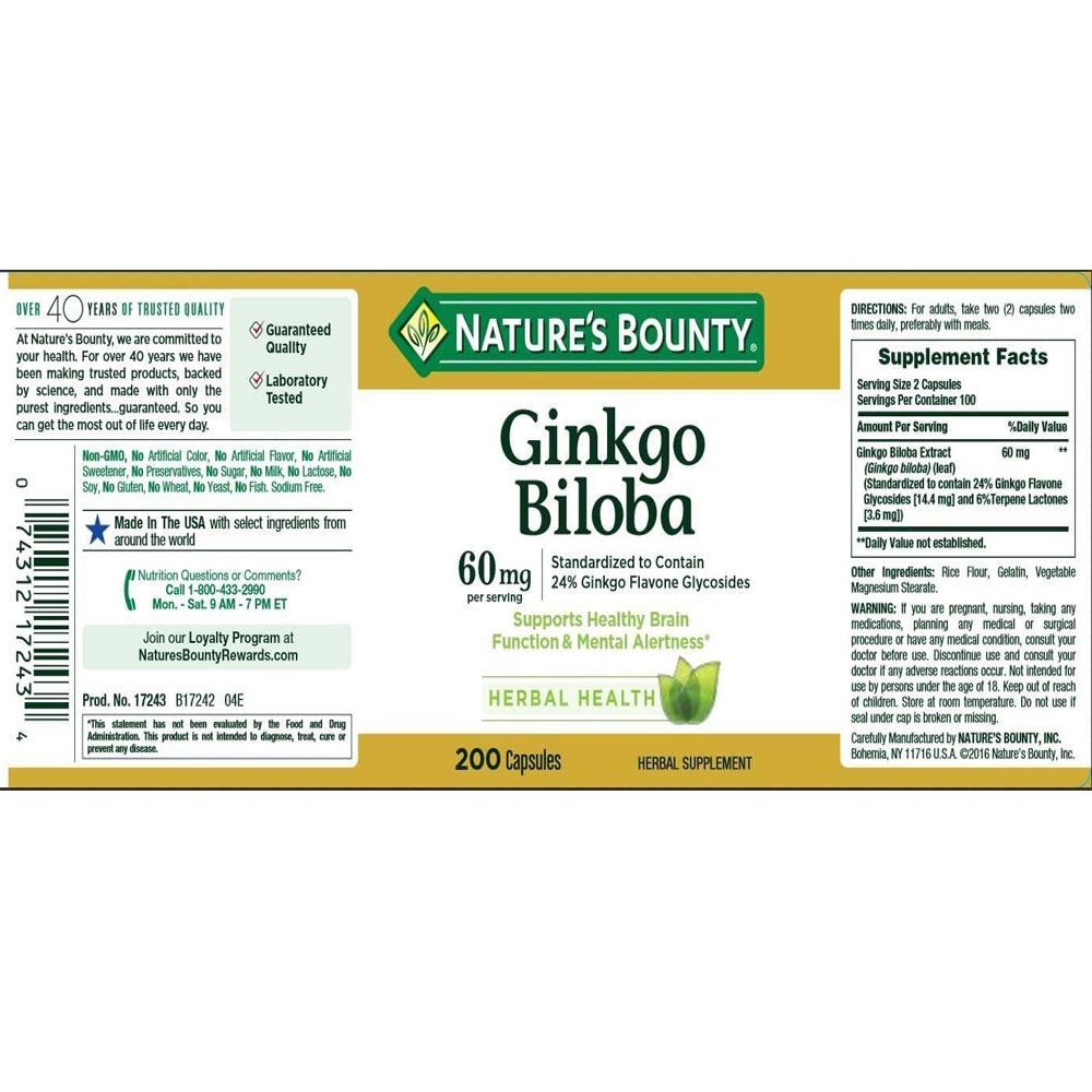 제품명  Nature's Bounty Ginkgo Biloba 60 Mg, 200 Capsules