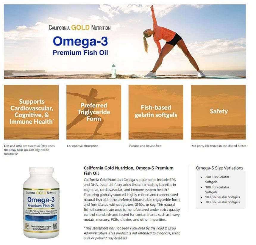 제품명 California Gold Nutrition, Omega-3 Premium Fish Oil, 180 EPA / 120 DHA, 100 Fish Gelatin Softgels