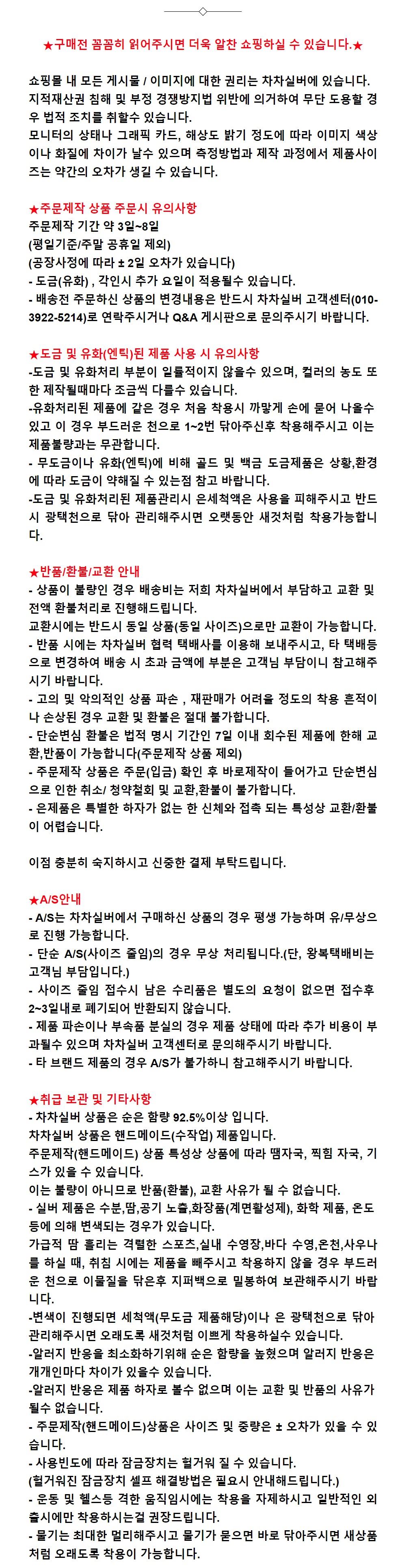 착용 시 주의사항 -미 착용시 부드러운 천으로 닦은 후 비닐팩 보관 / 사우나, 온천, 바닷물 착용금지 (무도금 외에 제품은 세척액 사용금지)