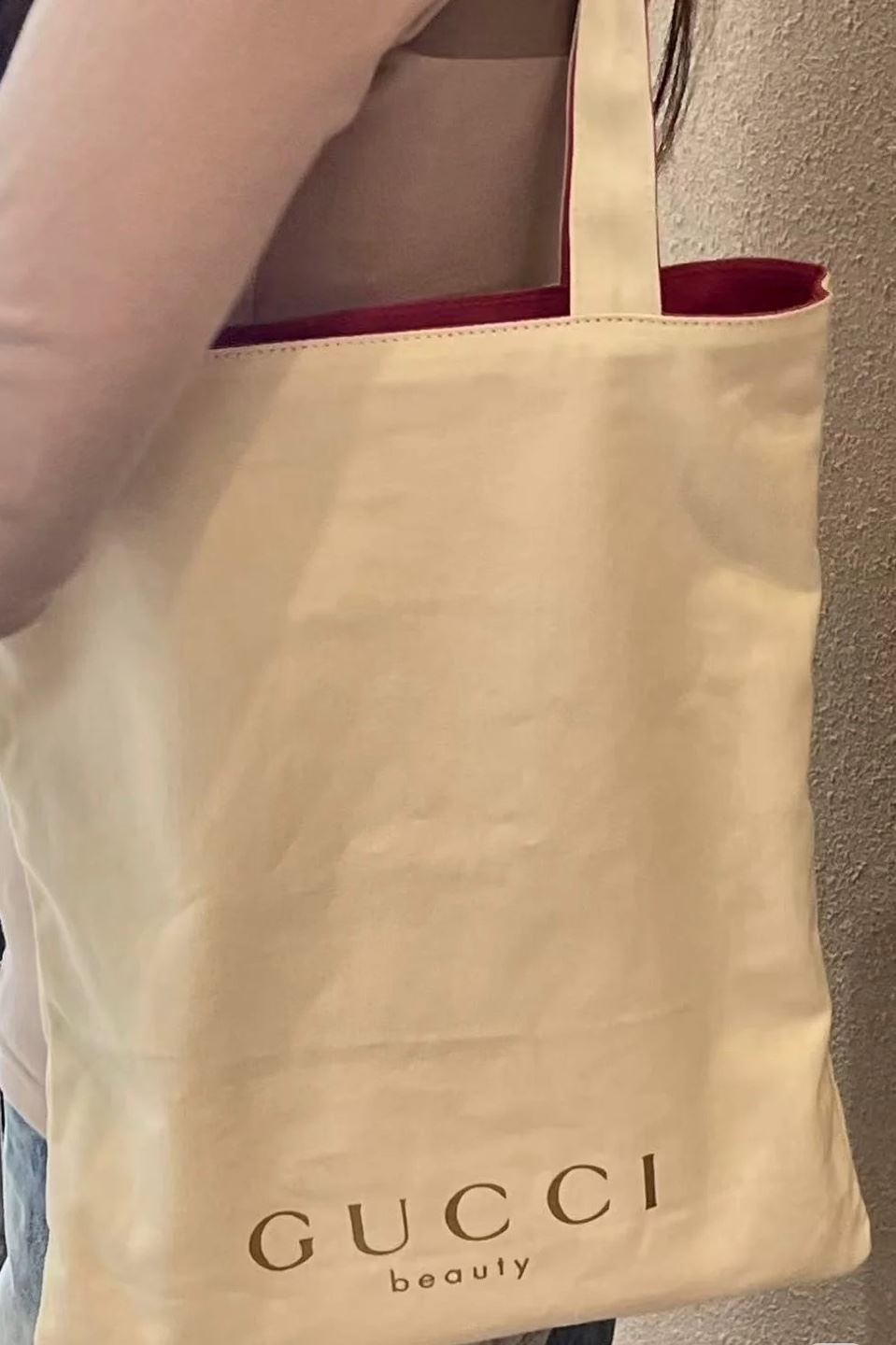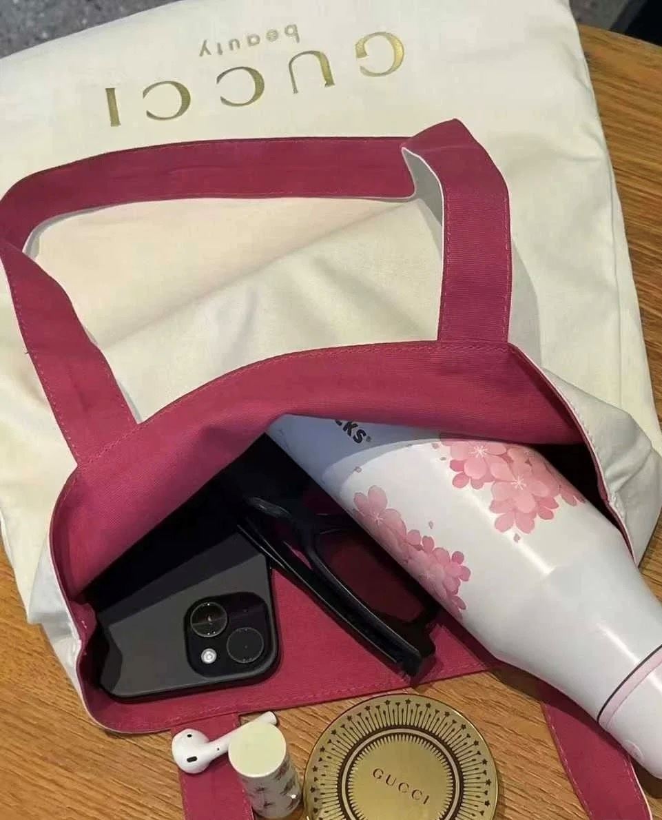 • 구찌 뷰티 핑크 아이보리 양면 캔버스 에코백
