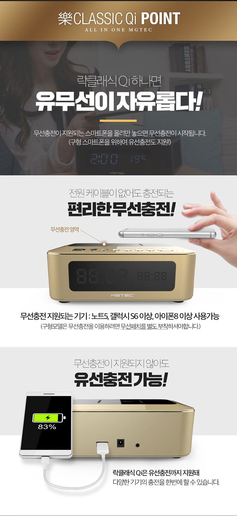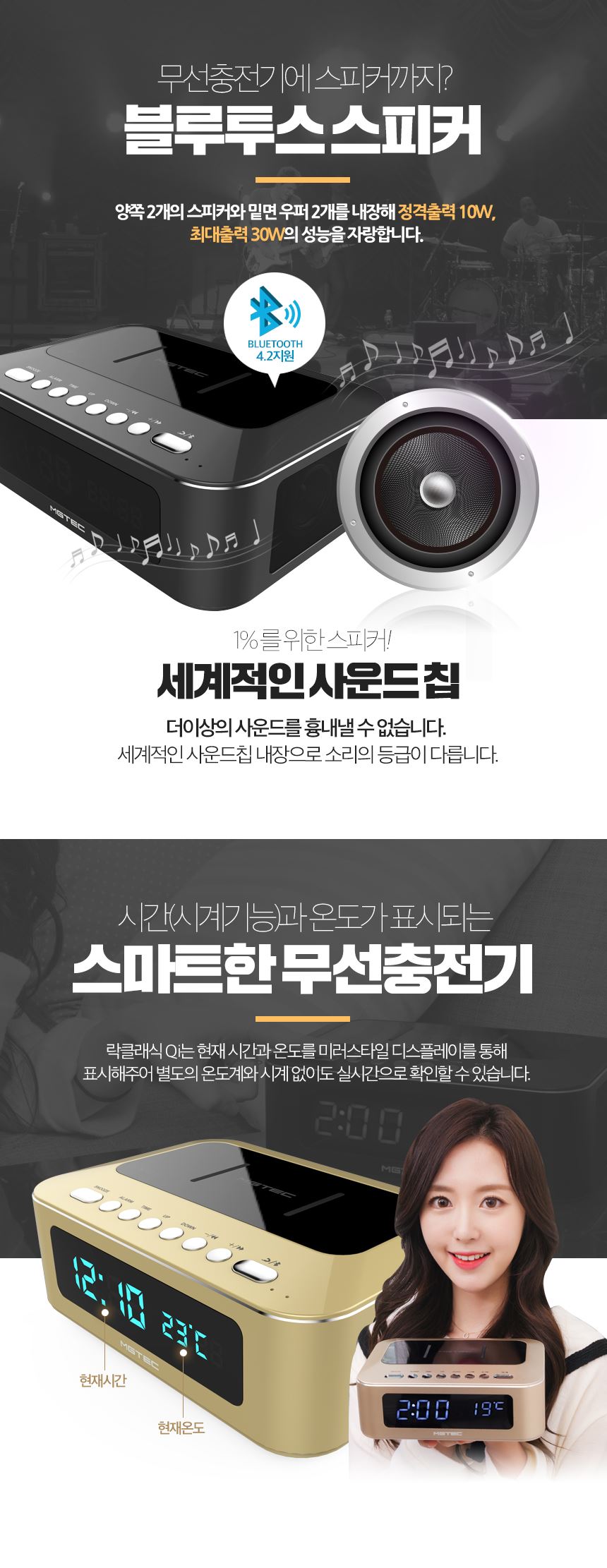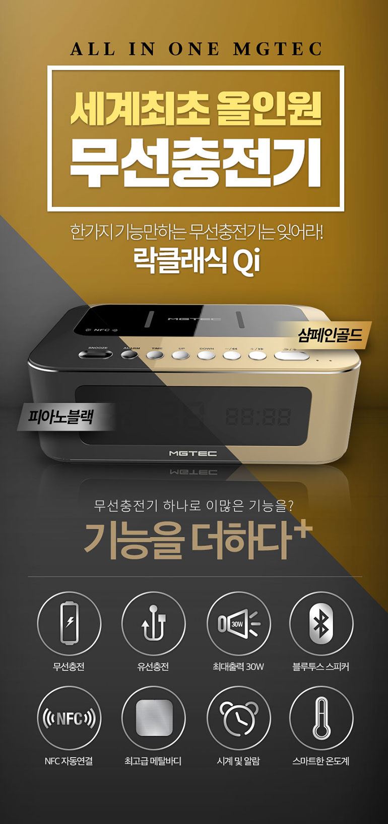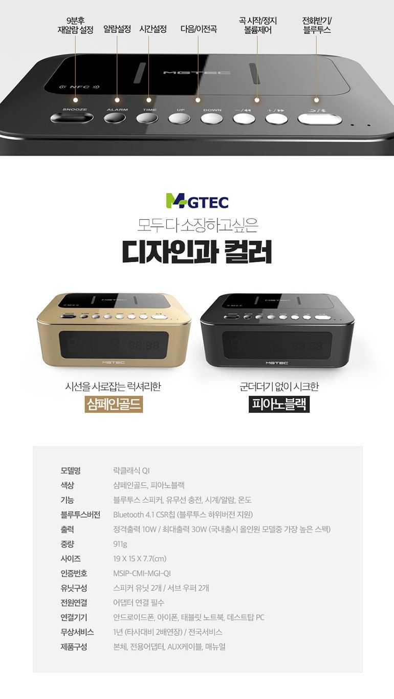 락클래식 QI/무선충전기/블루투스스피커/올인원 시계 온도 알람 블랙,골드