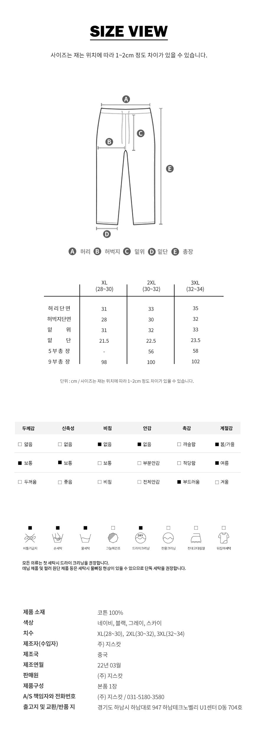 세탁방법 및 취급 시 주의사항 상품상세참조