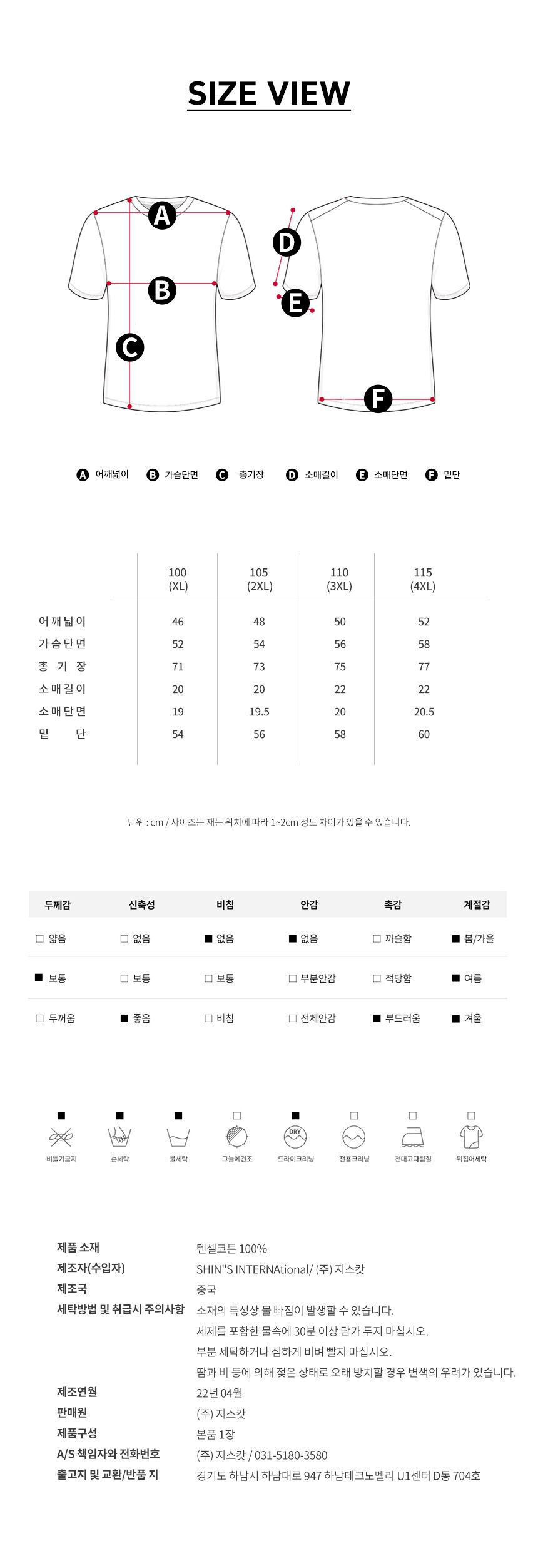 치수 XL (95~100),2XL (100~105),3XL (105~110),4XL (110~115)