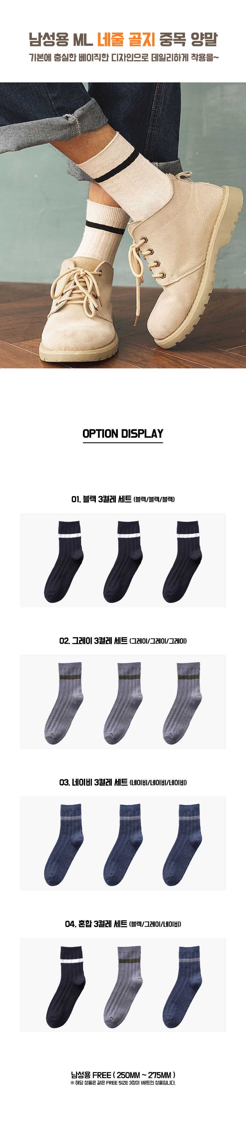 [SOC-013] 남성용 ML 네줄 골지 중목 양말 3켤레 세트