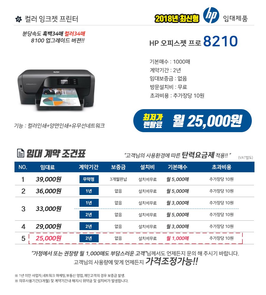 복합기임대 :) HP 오피스젯 8210 무한잉크프린터 서울인천경기전지역 설치비무료,잉크무료
