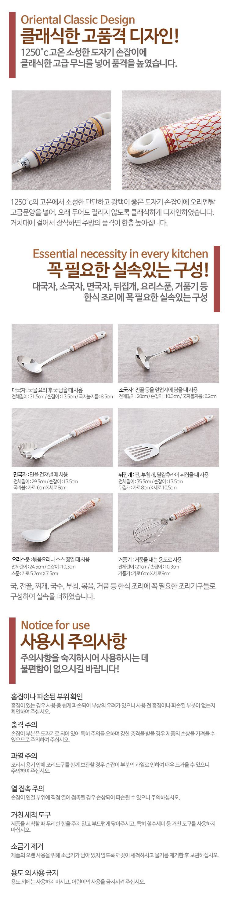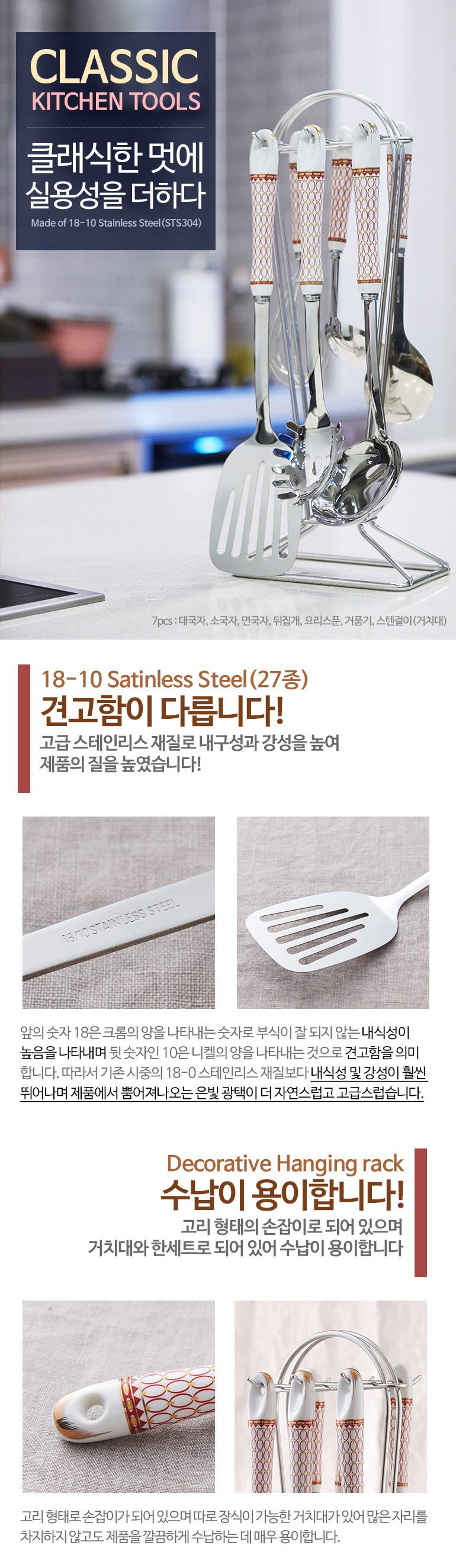 구성품 7pcs : 대국자, 소국자, 면국자, 뒤집개, 요리스푼, 거품기, 스텐걸이(거치대)