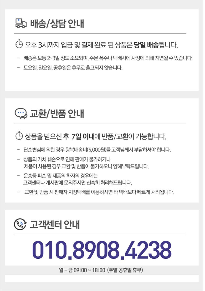 ㆍ 단순변심 및 고객님의 사정으로 반품, 교환 하실 경우, 반송비(교환의 경우 왕복배송비)는 고객님 부담입니다.