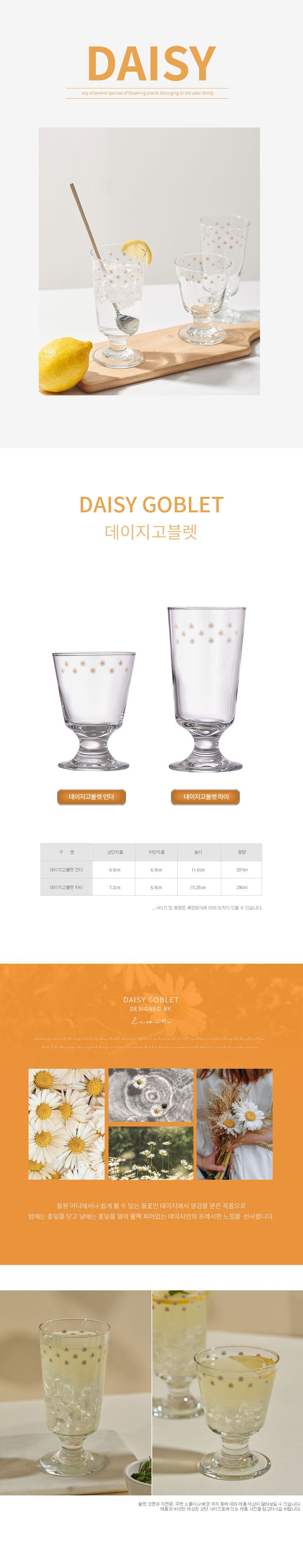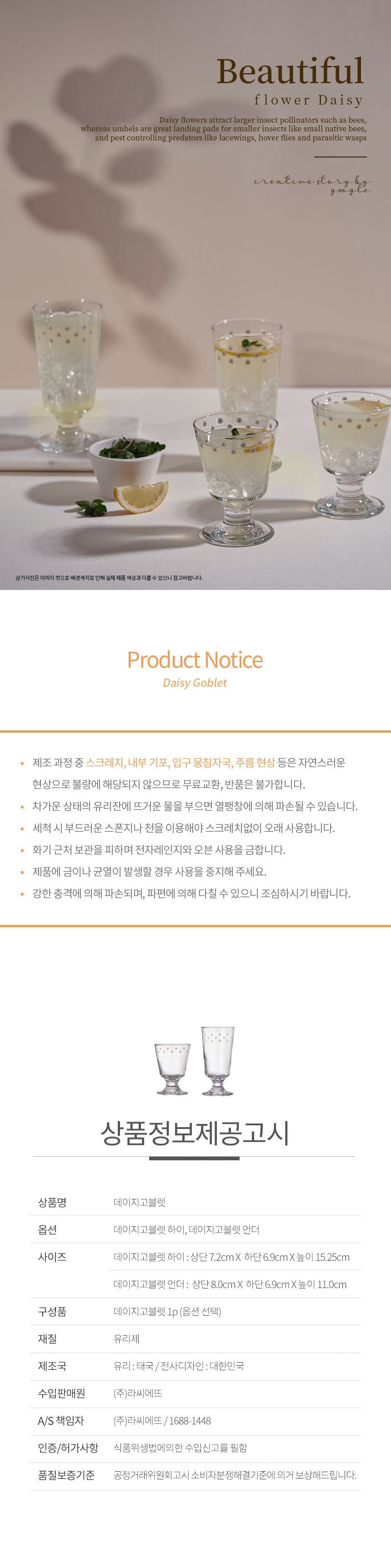 크기(m, cm, mm) 데이지고블렛 하이 : 상단 7.2cm x 하단 6.9cm x 높이 15.25cm 데이지고블렛 언더 : 상단 8cm x 하단 6.9cm x 높이 11cm