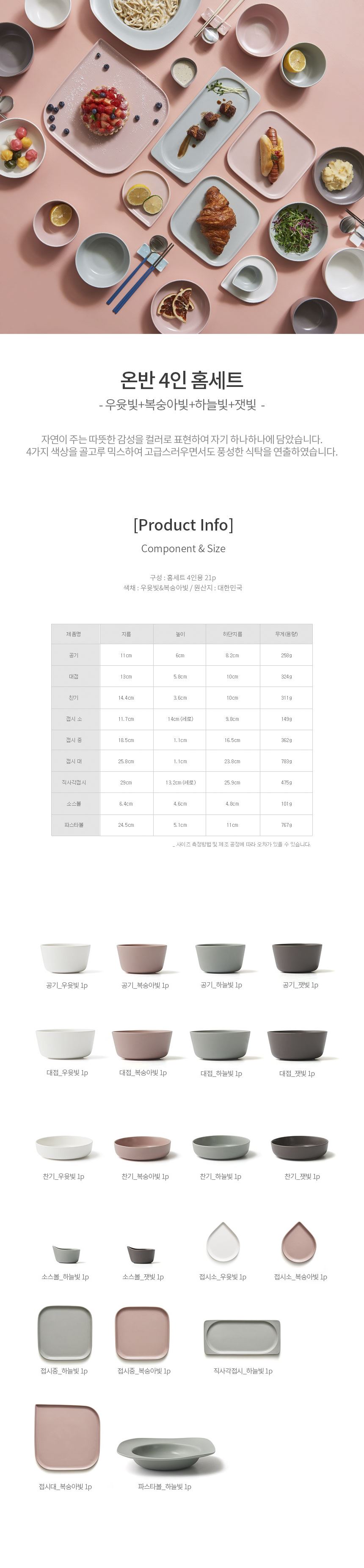 온반 4인 홈세트 21p 우윳빛 복숭아빛 하늘빛 잿빛