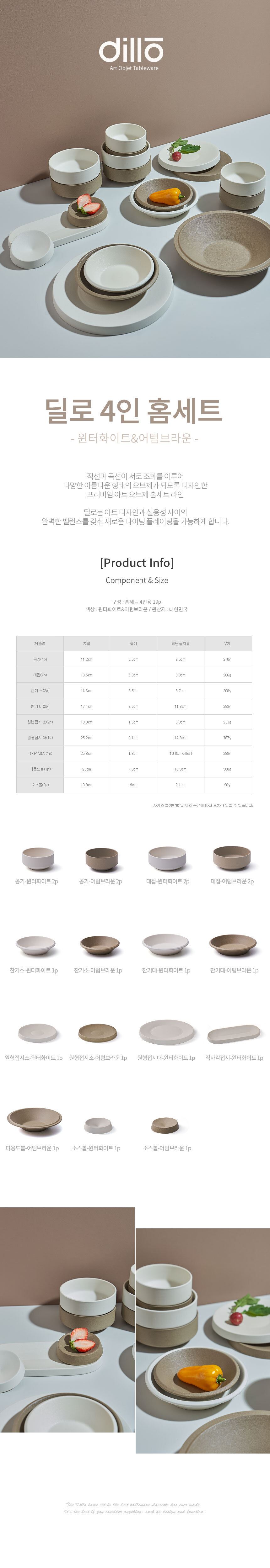 구성품 공기 4p, 대접 4p, 찬기 소 2p, 찬기 대 2p, 원형접시 소 2p, 원형접시 대 1p, 직사각접시 1p, 다용도볼 1p, 소스볼 2p (총 19p)