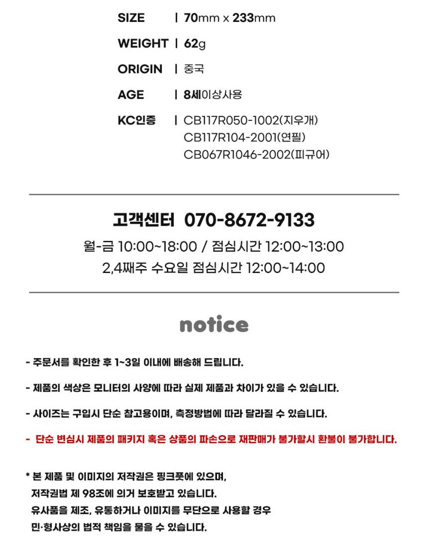 ㆍ 수령일로부터 7일 이내 반품, 교환 가능합니다.