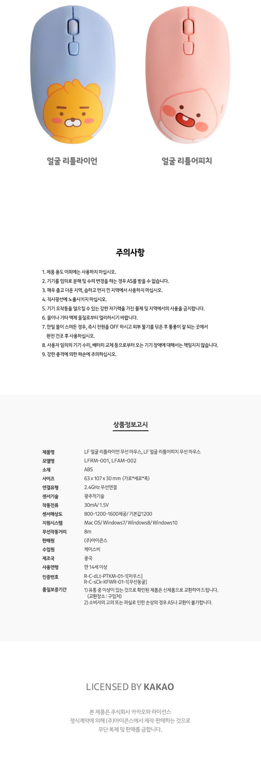 품명 리틀카카오프렌즈 무선 마우스