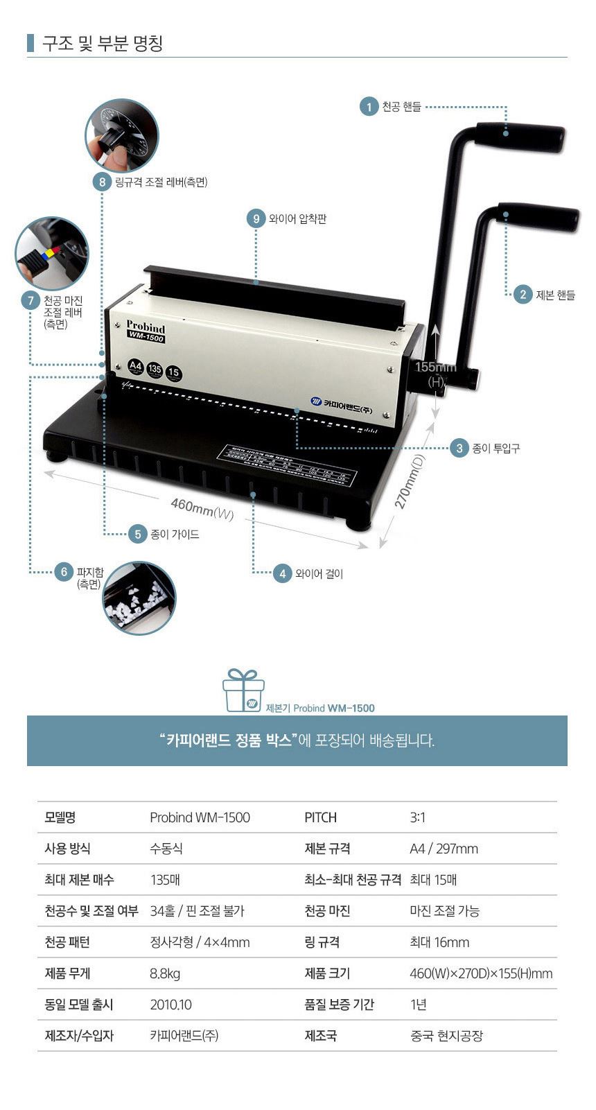 • 카피어랜드 3:1 와이어링 A4 수동 제본기 probind WM-1500