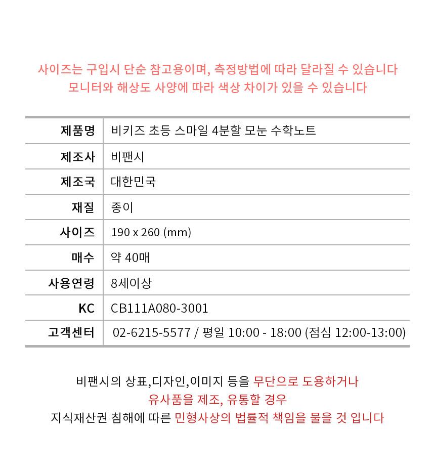 비키즈 초등노트 오답 필기정리 그리드 스마일 4분할 모눈 수학노트 / 설래임 / 디비디비 / 구매하기 / 특가할인