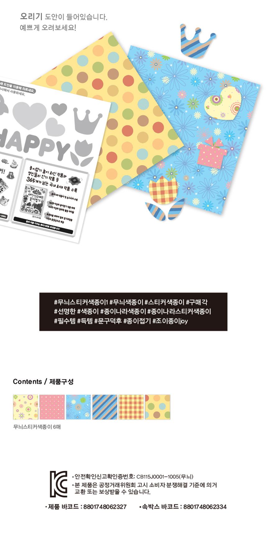 종이나라 내 마음대로 무늬 스티커 색종이1 6색 6매 1갑(20팩) / 설래임 / 디비디비 / 구매하기 / 특가할인
