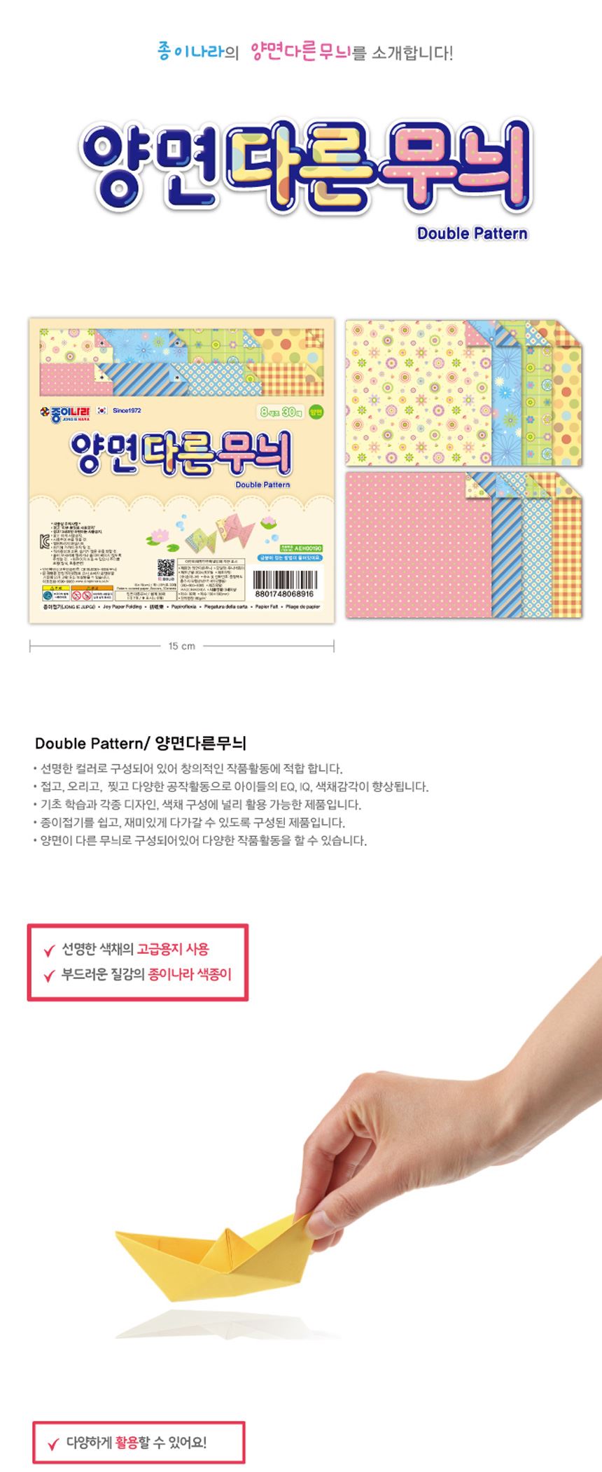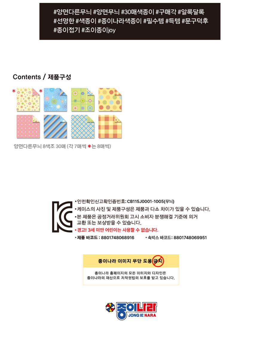 종이나라 공작놀이 양면 다른무늬 색종이 8색30매 1갑(10팩)