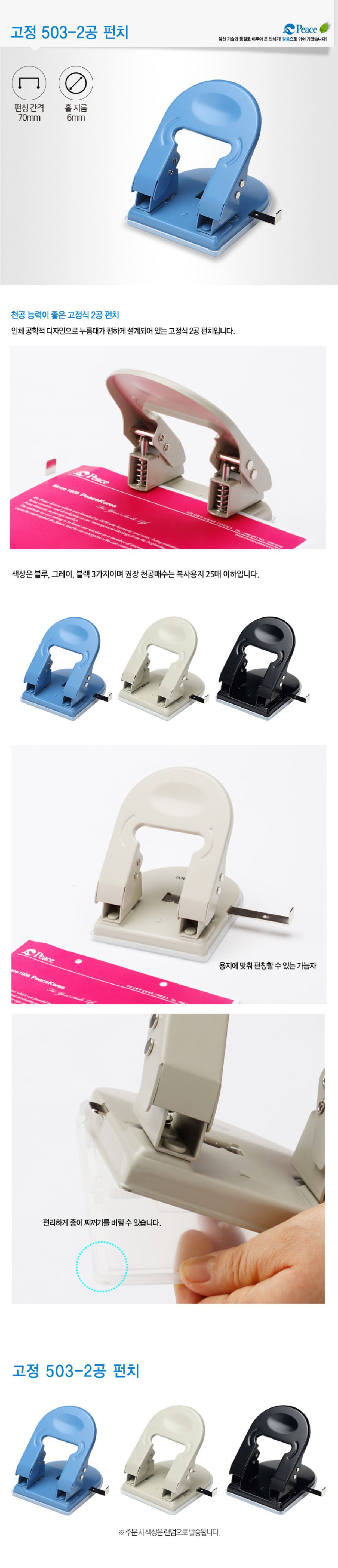 • 평화 6mm 25매 천공 제본용 503 2공 고정펀치 랜덤색상