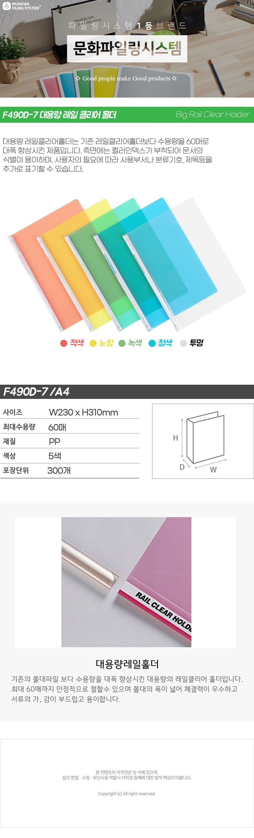문화산업 A4 쫄대파일 대용량 레일 클리어 홀더 F490D-7 1봉(10장)