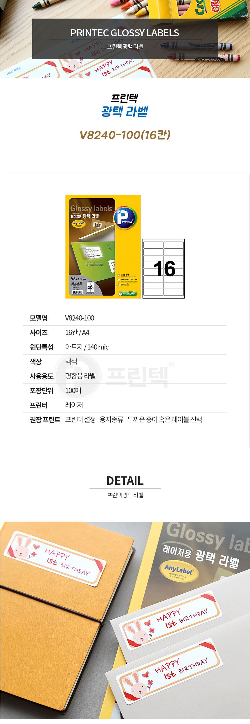 • 프린텍 레이저용 광택라벨 애니라벨 16칸 100매 V8240-100
