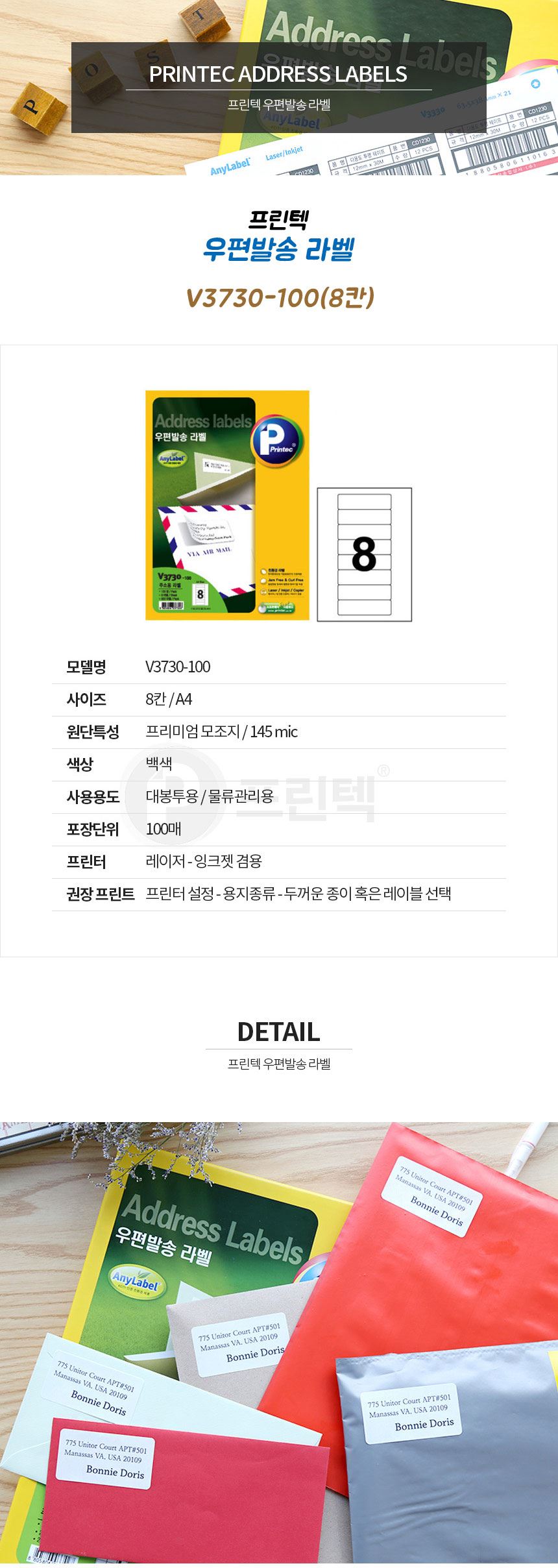 프린텍 우편발송라벨 애니라벨 8칸 100매 V3730-100 / 설래임 / 디비디비 / 구매하기 / 특가할인